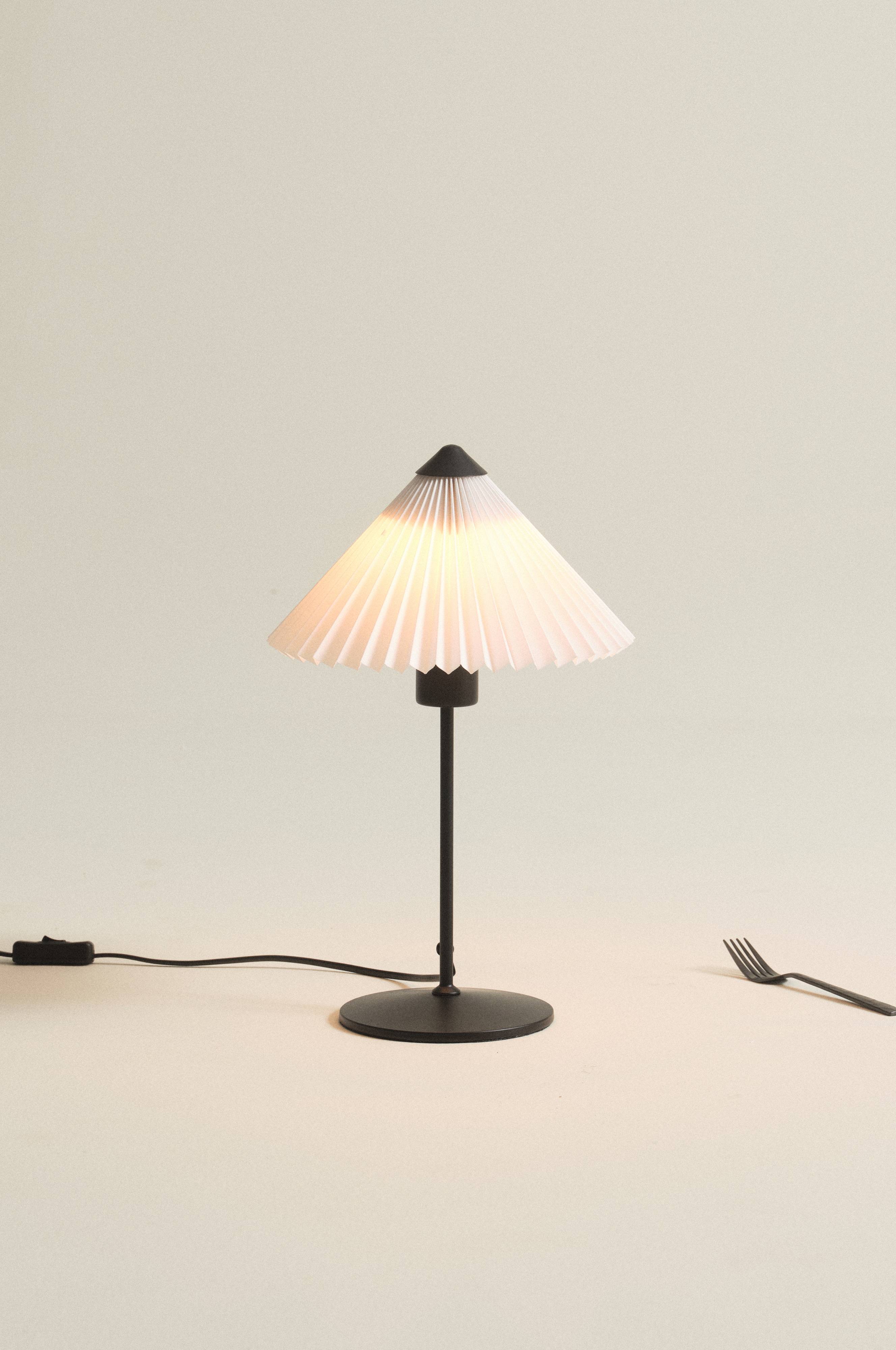 Bordlampe LORI er enkel og nem at placere med sortlakeret metalfod og lys, plisseret stofskærm. Skærmen har diskret metalstel og sort top. Sort plastledning med afbryder på ledningen.