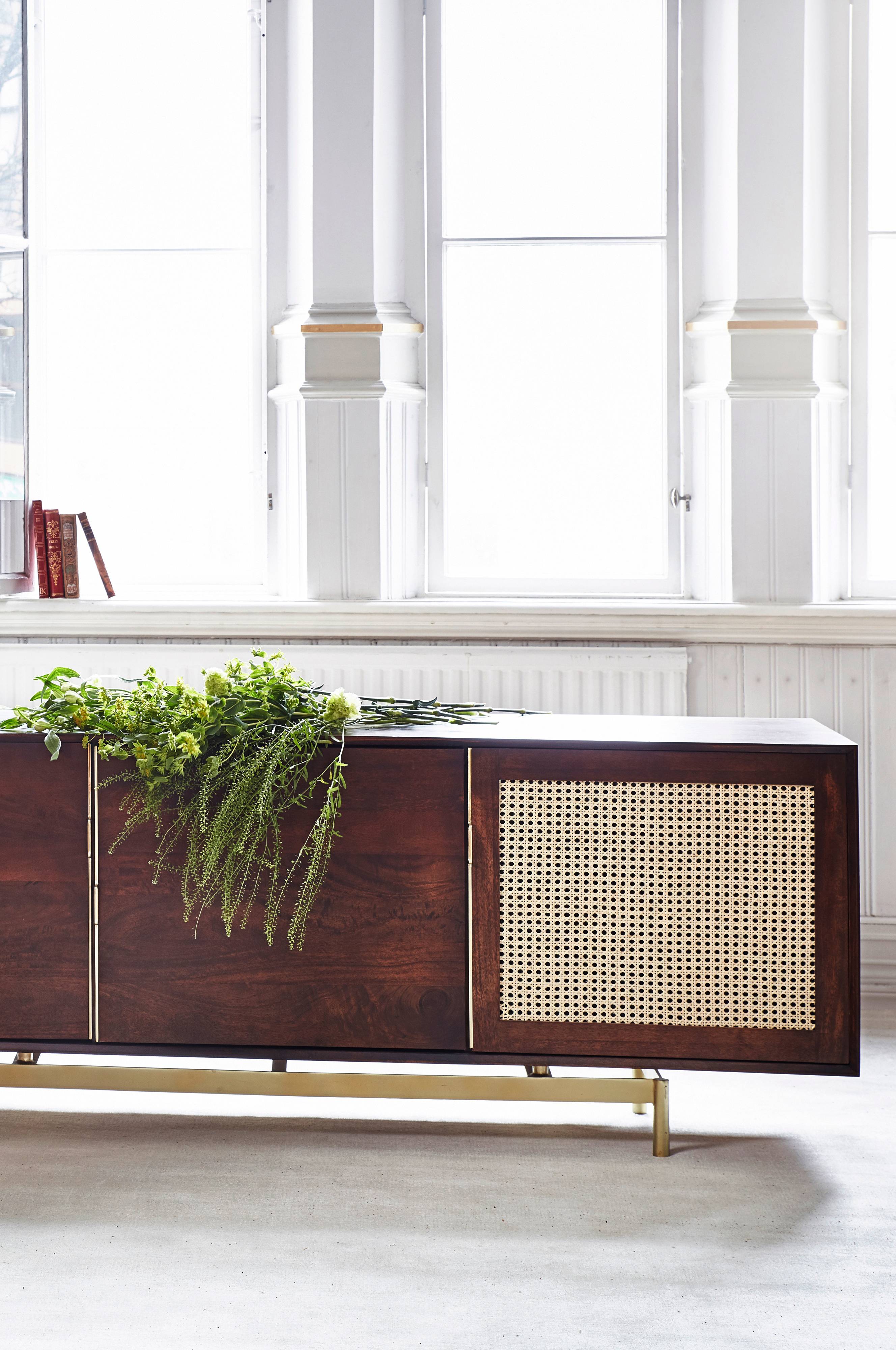 Mahognifarvet skænk med detaljer som giver det helt rigtige retrolook og får en til at tænke på 60'erne. Dørene har fine, guldfarvede metalbeslag som matcher benene.