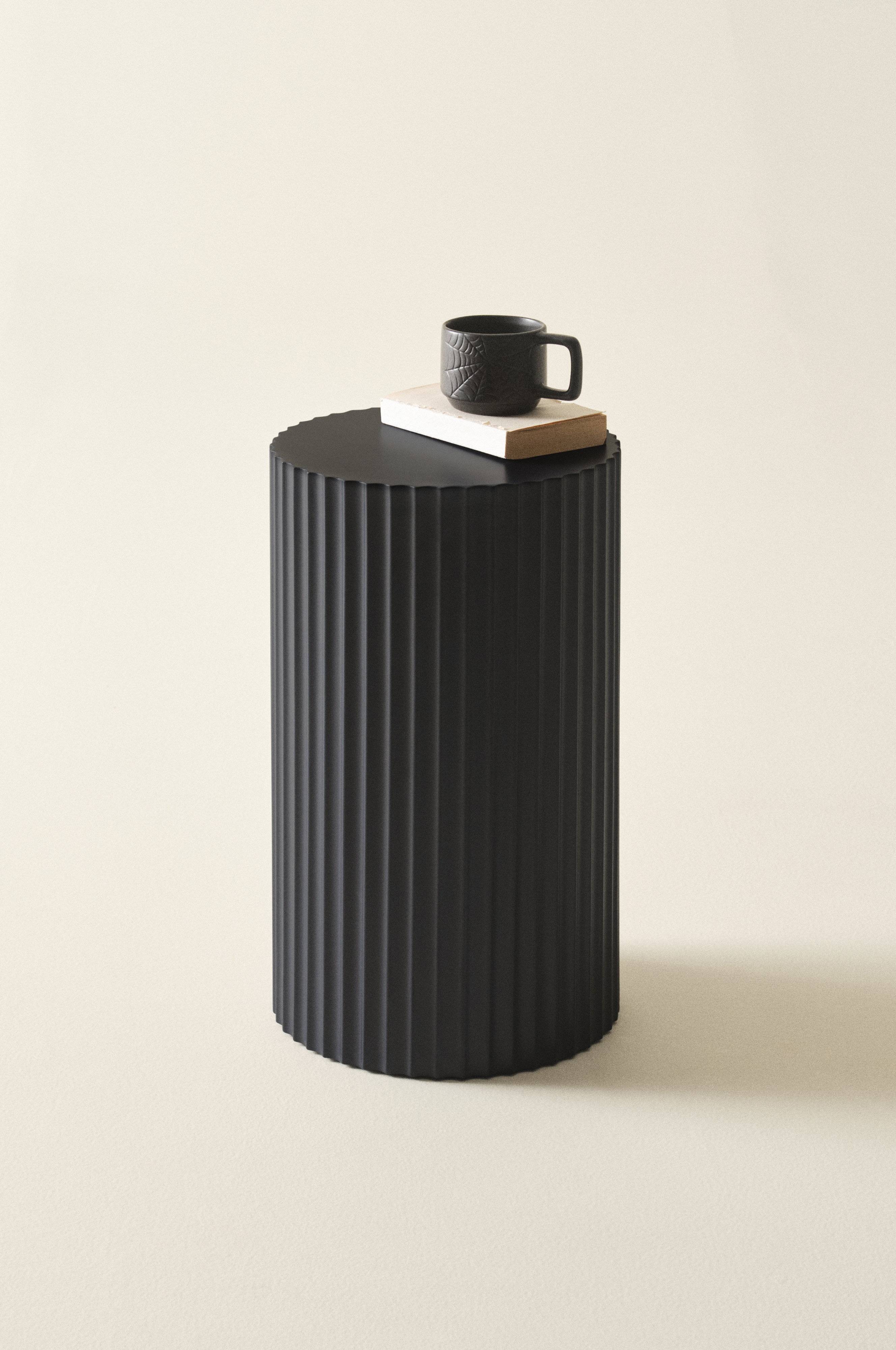 Rundt sidebord af FSC-mærket MDF som er lakeret med mat farve. Bordpladen er glat mens siden er riflet rundt om hele bordet. Bordet er lidt lavere og gør sig fint ved sofaen eller som sengebord.