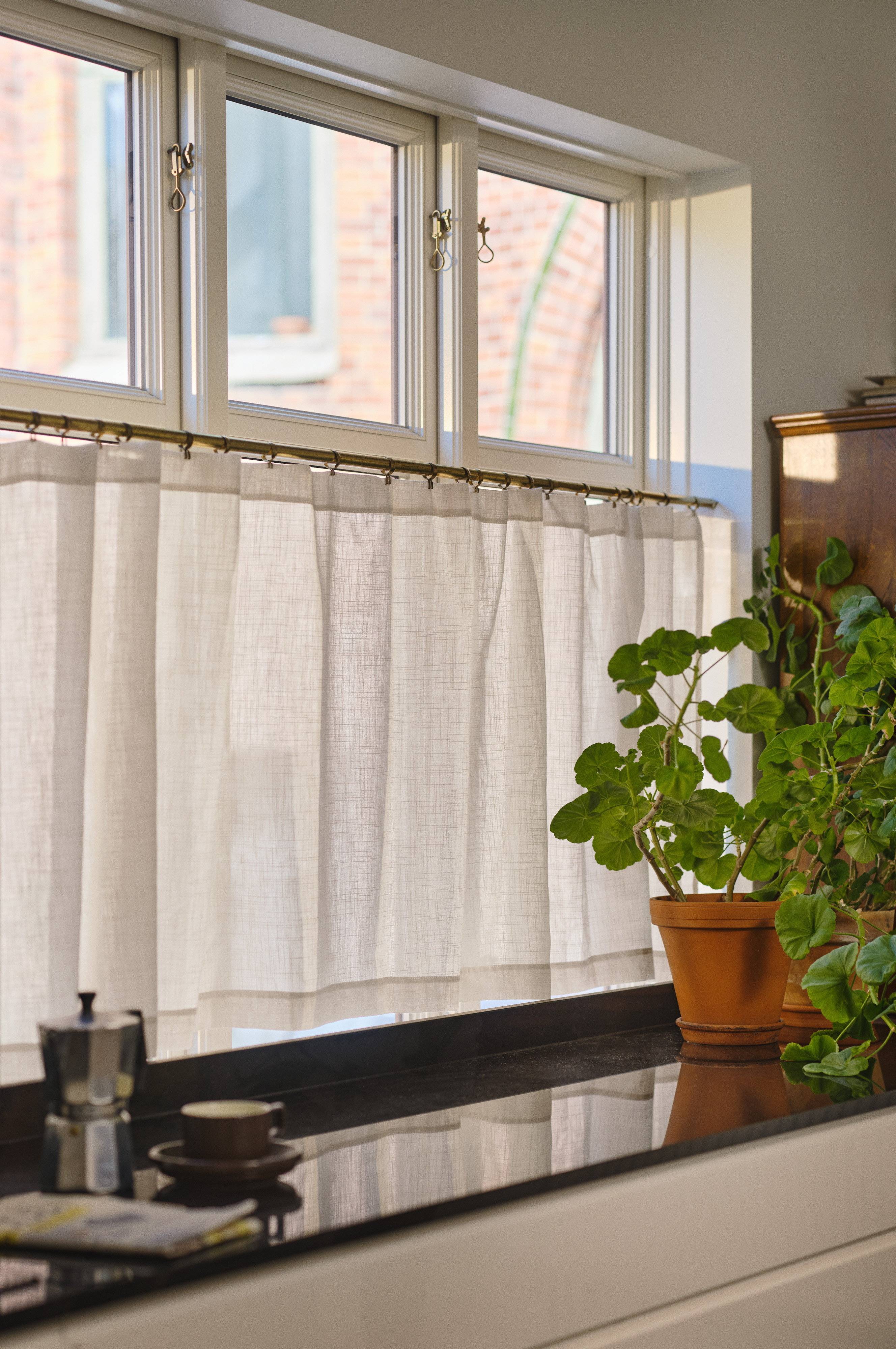 Et cafégardin i luftigt stof med en meleret effekt. Stoffet er vævet i bomuld og har en dejlig afslappet fornemmelse. LUNI café-gardinet har en syet kanal i toppen, og det hænges på en gardinstang nederst i dit vindue og giver dermed privatliv, mens lyset kommer ind over gardinet, skønt altid at kunne se himlen.