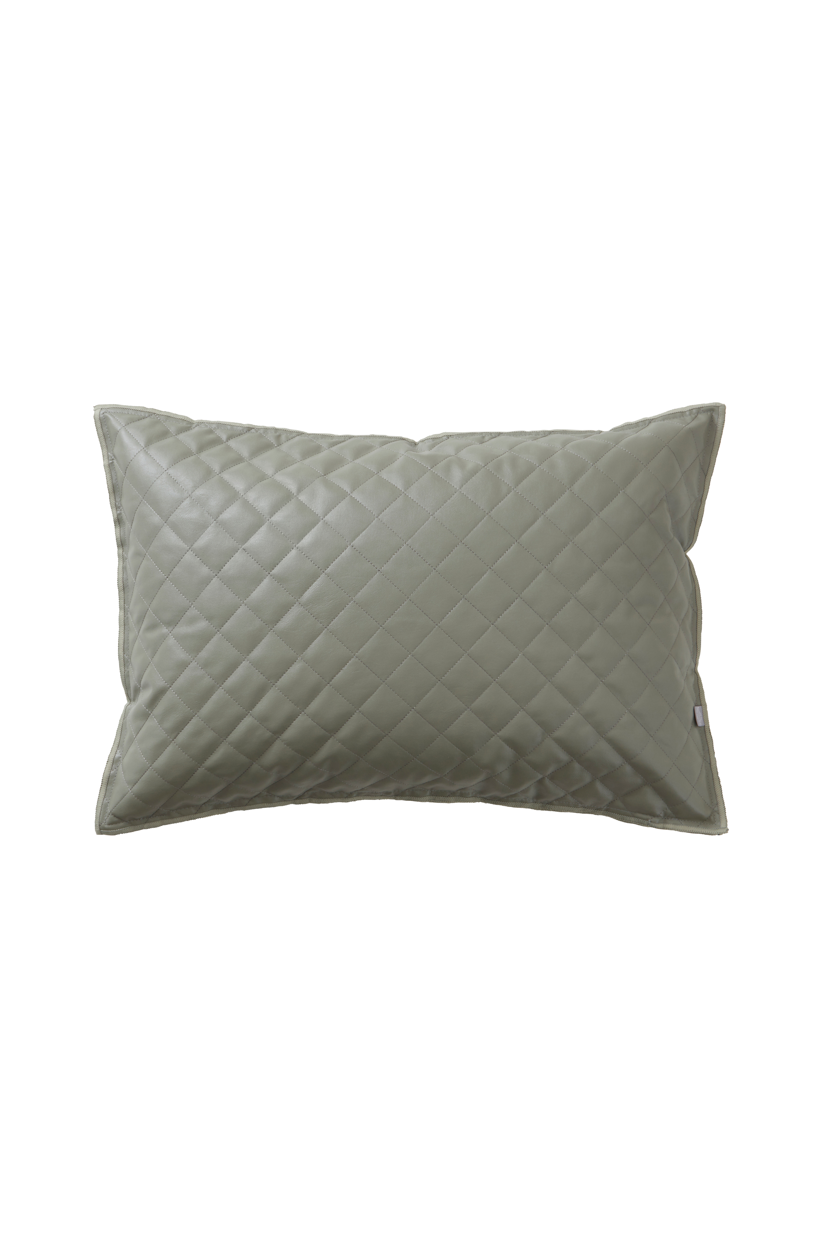 1-pak pudebetræk i kunstlæder af polyuretan. Pudebetrækket har effektfuldt, quiltet ternet mønster og overlocksøm rundt i kanten. Lynlås i kanten forneden.