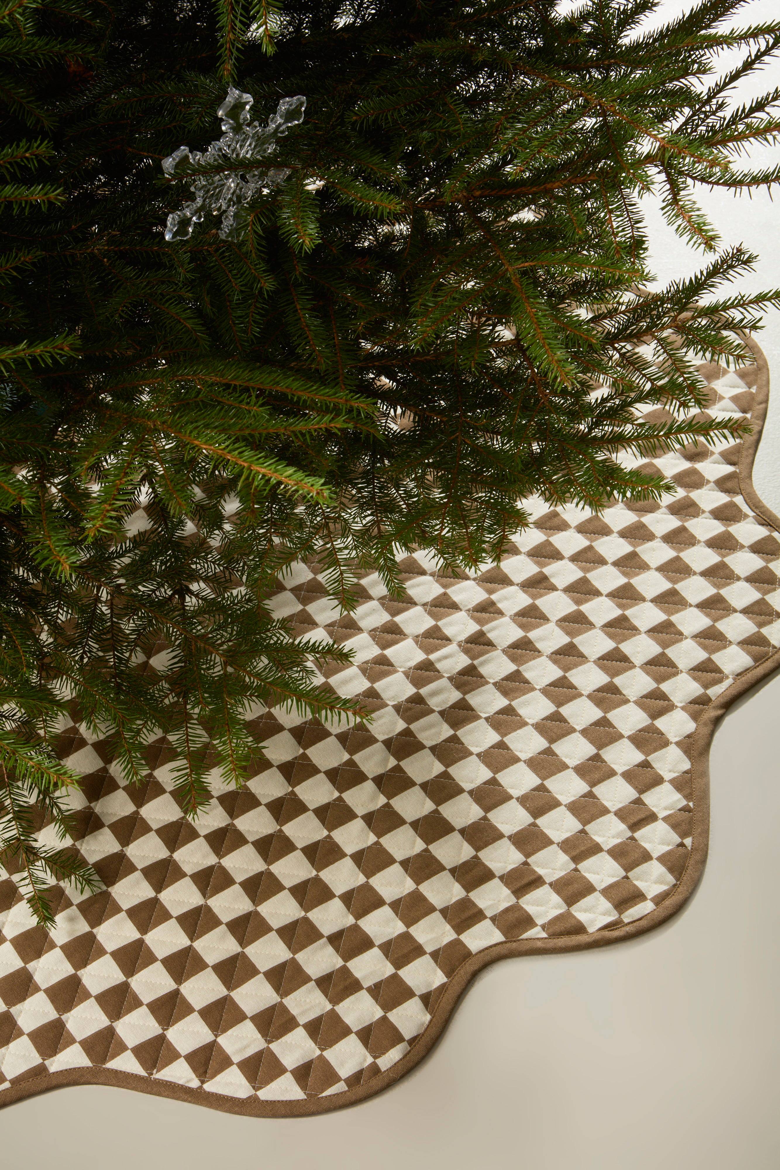 Tæppet LYRA er charmerende med sin blomsterlignende runde form. Det er fremstillet af bomuld med en bagside af bomuldslærred og er perfekt til at lægge under juletræet. Tæppet er quiltet med tynd polstring, og det trykte firkantede mønster og de fine kanter giver en behagelig fornemmelse. Tæppet er vendbart, så du kan vælge mellem et mønster eller en ensfarvet farve, der passer til din stil.