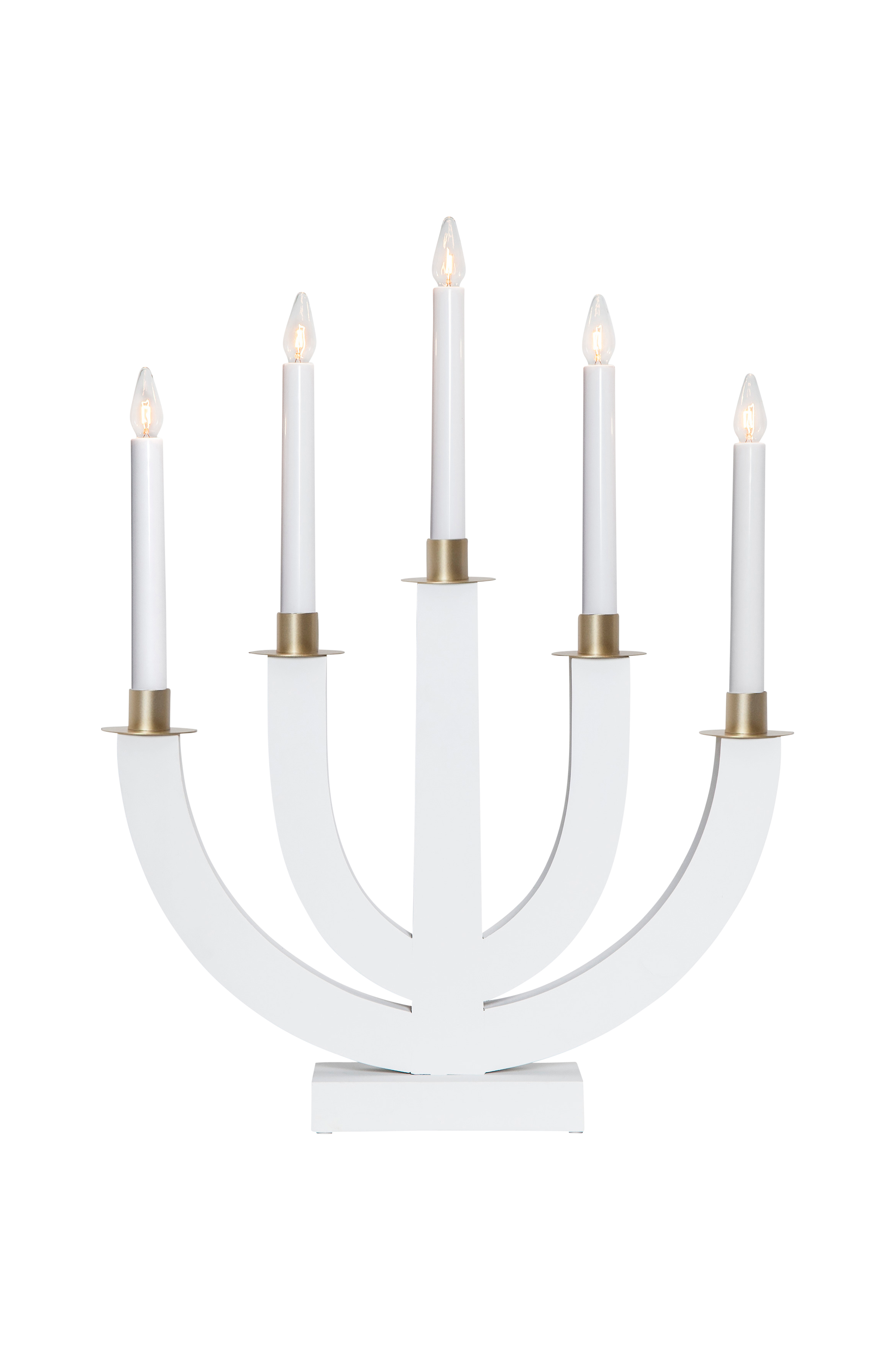 Trælysestage med 5 lyskilder og guldmalet dekoration. Let at placere og skaber skøn julestemning både i vinduet og i rummet, f.eks. på en hylde eller skænk. E10-fatning, pærer medfølger. Hvid ledning, 180 cm. Højde 47 cm, bredde/længde 37 cm og dybde 8 cm.