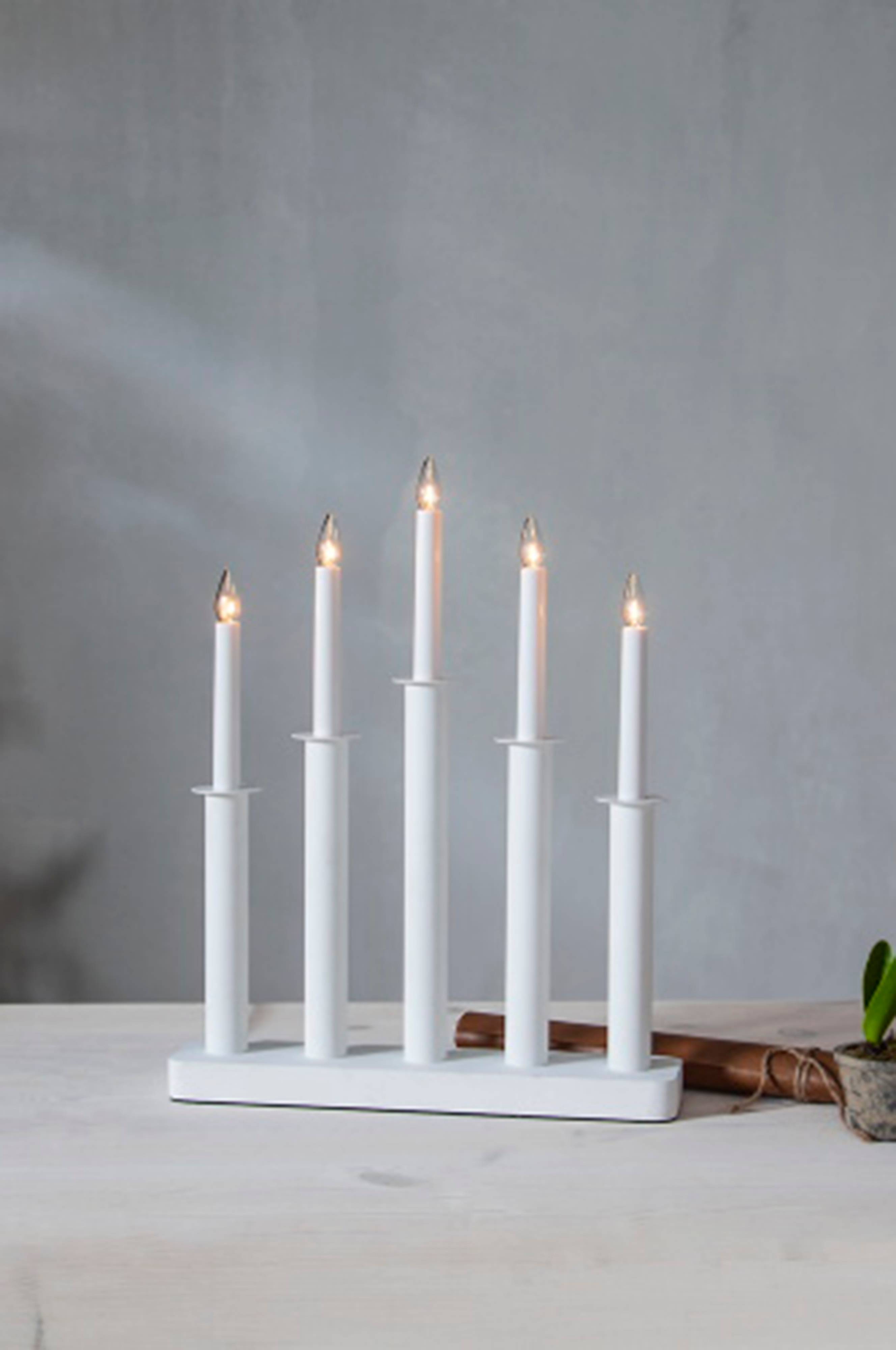 Moderne hvid adventslysestage fremstillet i træ med matchende metaldekoration. Pynt op med den til advent og jul, stil den i et vindue eller på en skænk.
