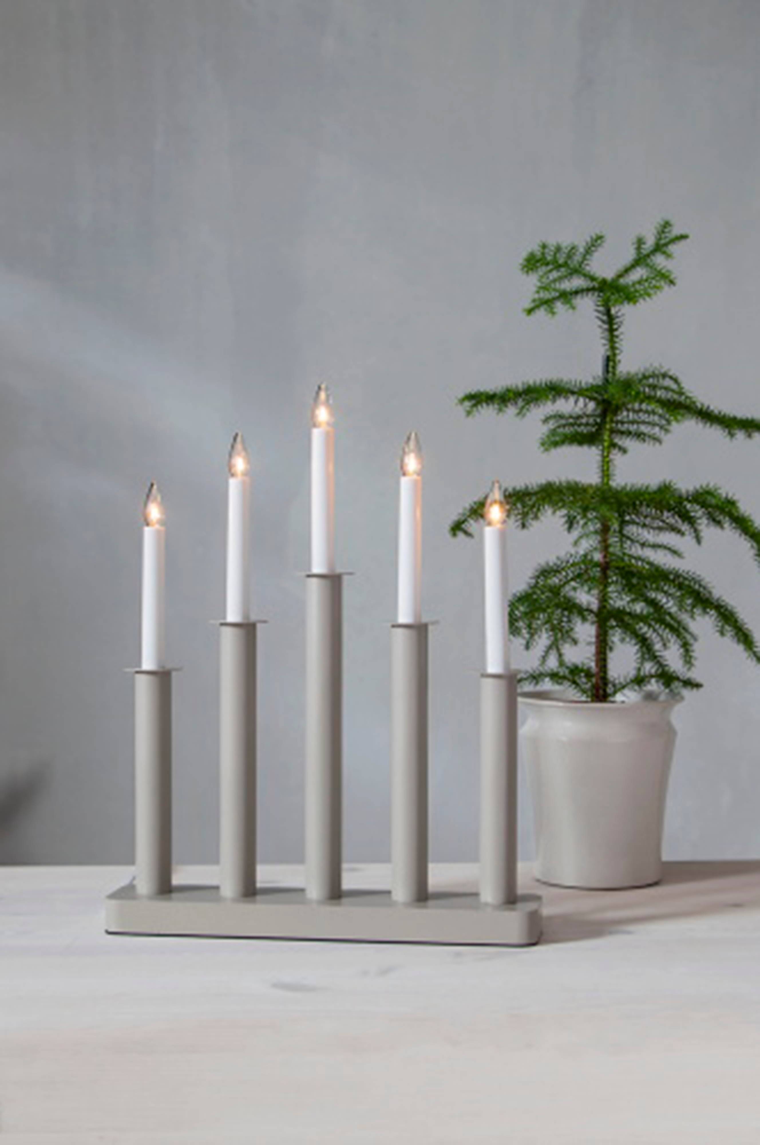 Moderne hvid adventslysestage fremstillet i træ med matchende metaldekoration. Pynt op med den til advent og jul, stil den i et vindue eller på en skænk.
