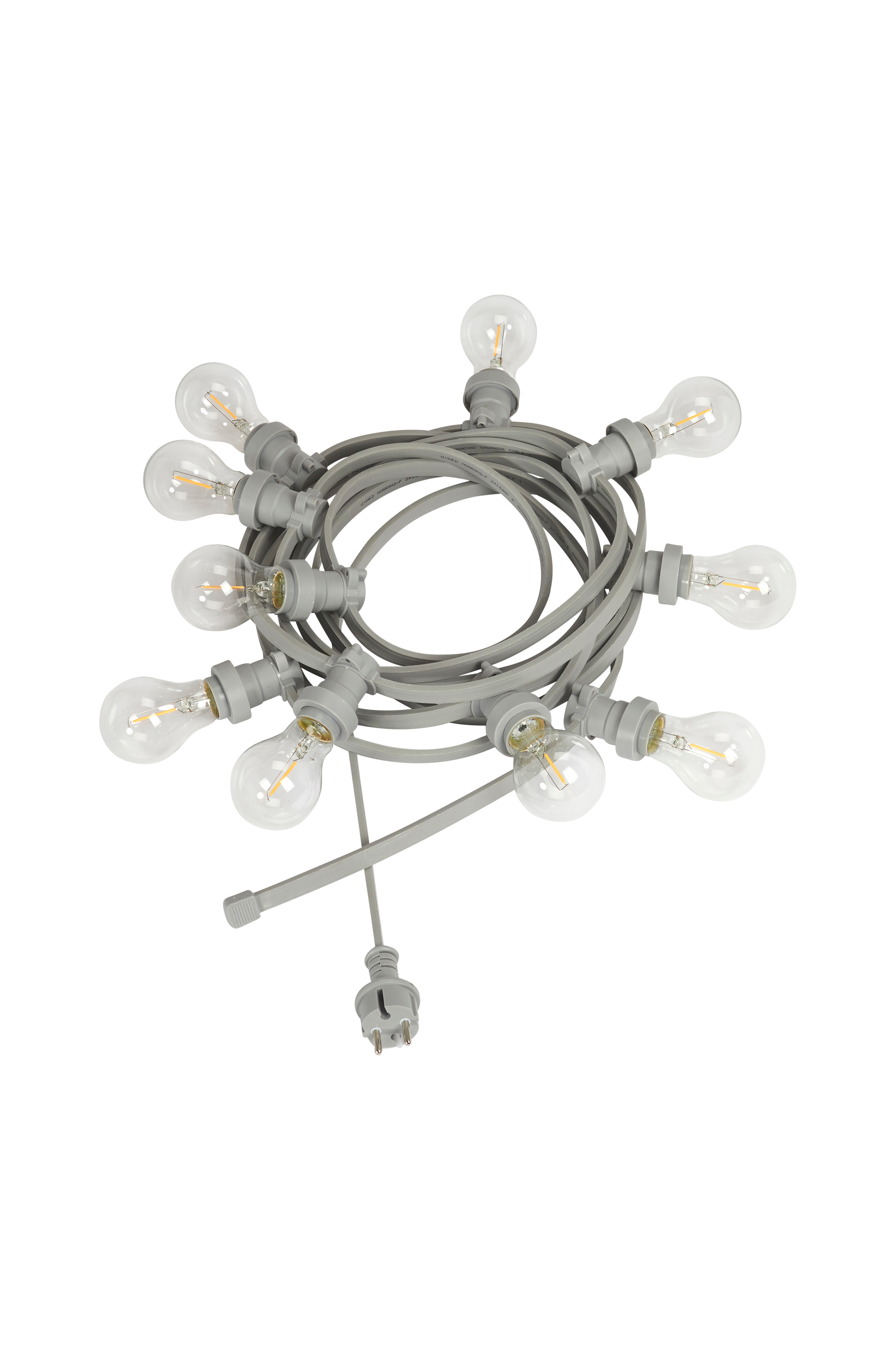 En flot og stilren lyskæde til udendørs brug med 10 klare glødepærer.
