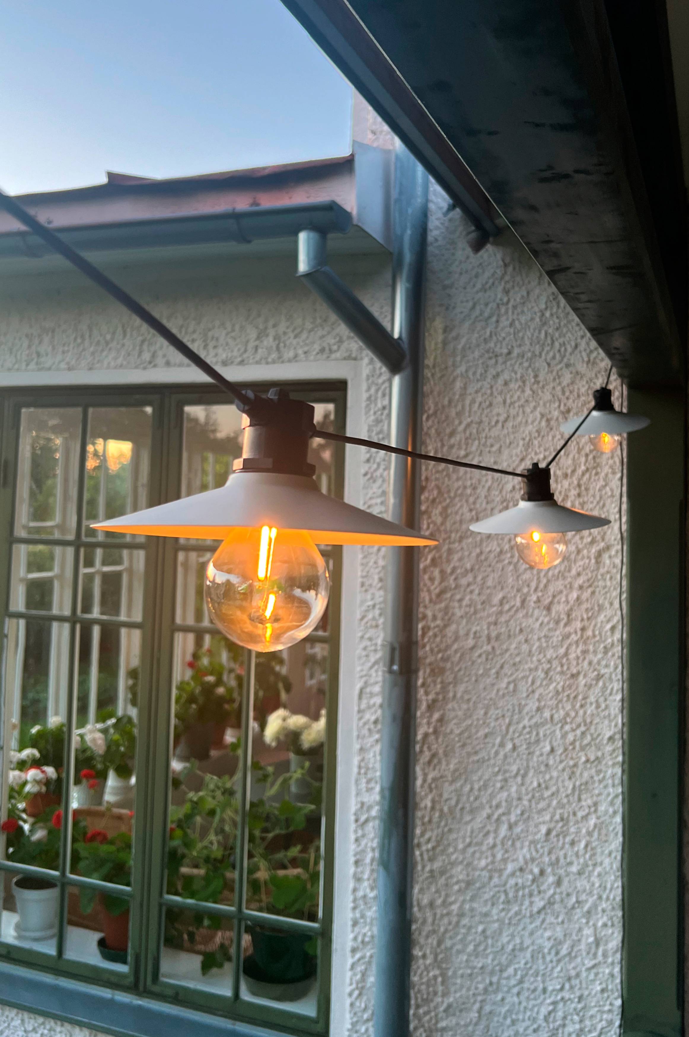 Donna lyskæde med glatte skærme i metal. Lyskæden har 6 skærme med faste LED-pærer. Tilpasset til udendørs brug med klassificering IP44, men kan også hænge indendørs. Total længde 7,9 meter. 3 meter til første lampe og derefter 0,7 meter mellem hver lampe. Pærerne kan ikke udskiftes.