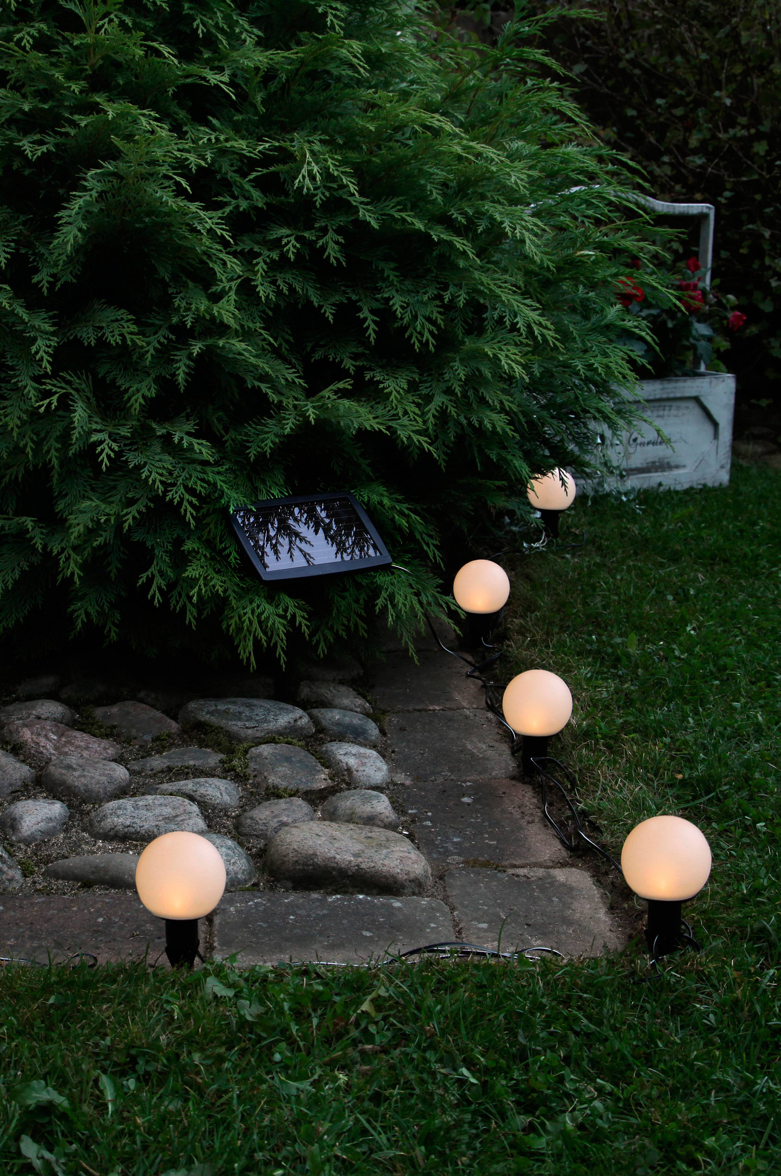 Solcellekugler i plast. LED. Kan bruges både som lyskæde og som spyd i haven. Mål: Længde 700 cm. Dybde 8 cm. Højde 8/22 cm. Batteri medfølger.