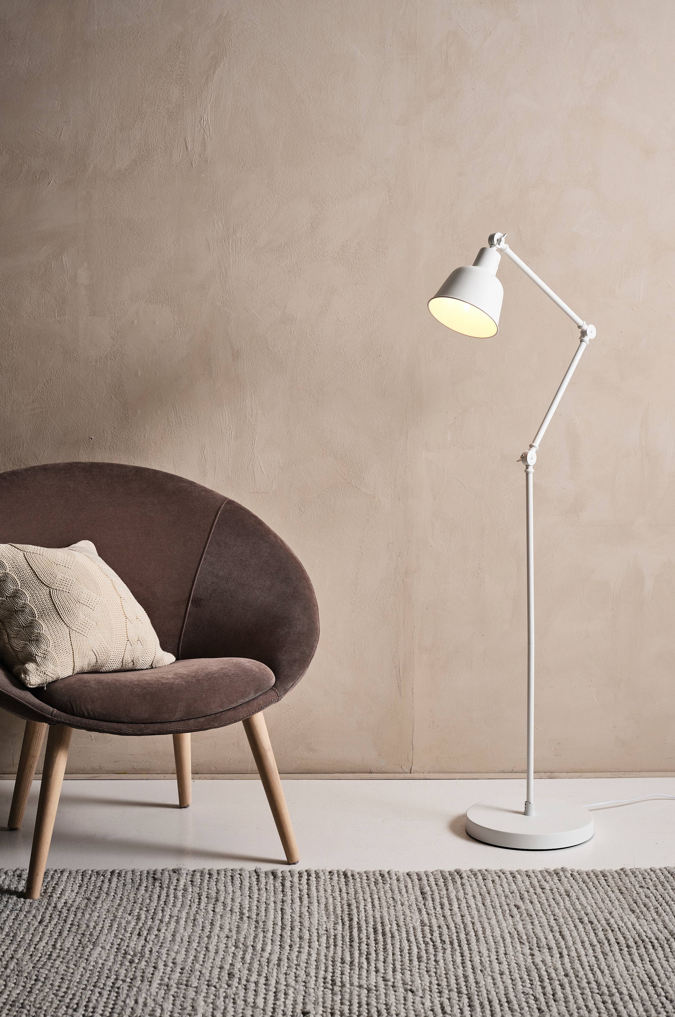 Moderne gulvlampe af metal. Justerbar i tre led, så lyset kan drejes efter ønske og smag. Ledningslængde 1,8 m.