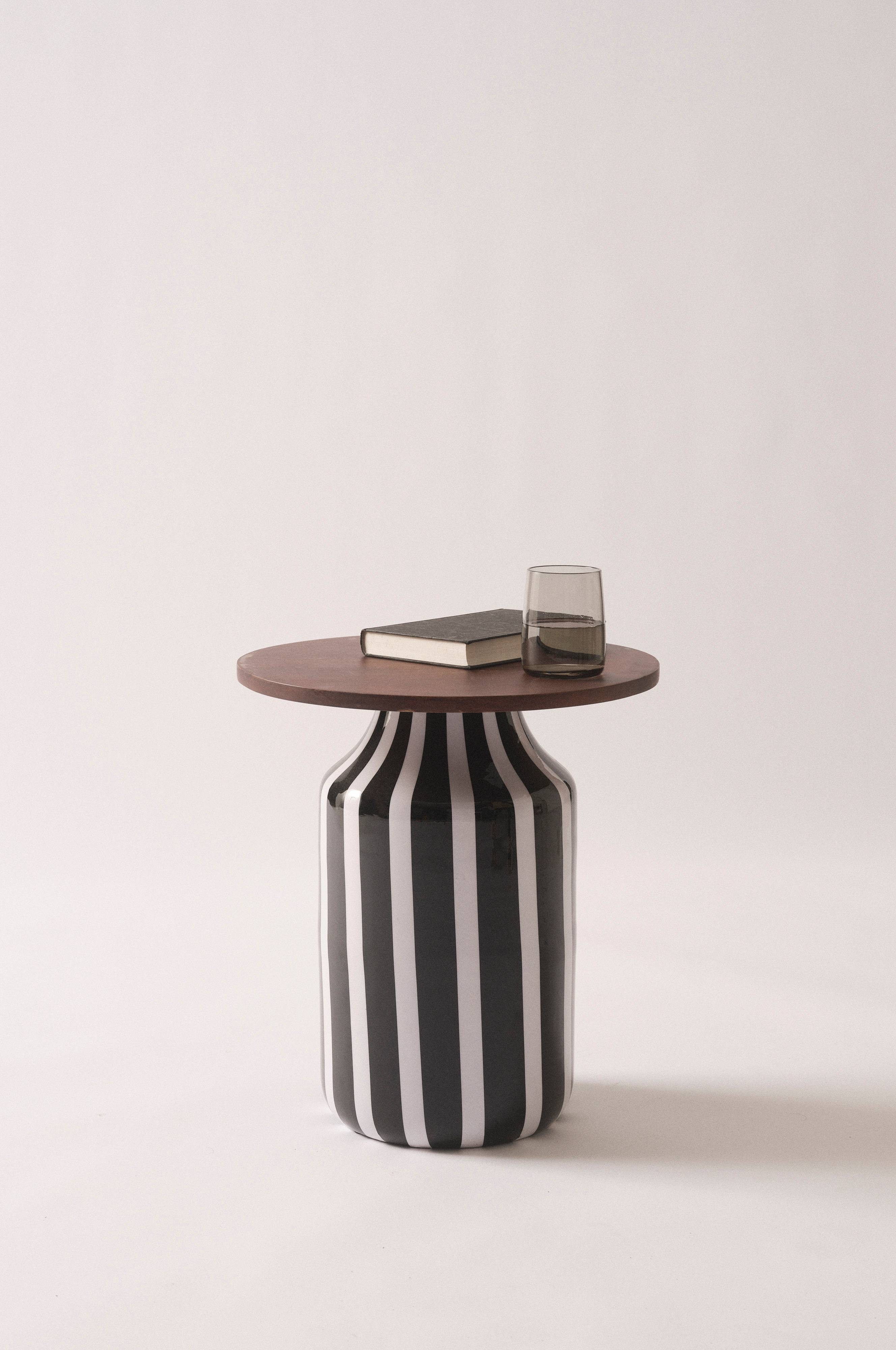 Rundt sidebord med bordplade af massivt mangotræ og fod af jern. MAROON er håndlavet og hvert bord er unikt. Bordpladen har glat, fin overflade og ådringen er synlig. Foden som er af emaljeret jern er huller og stribet. MAROON er et lille smart bord som frisker op.