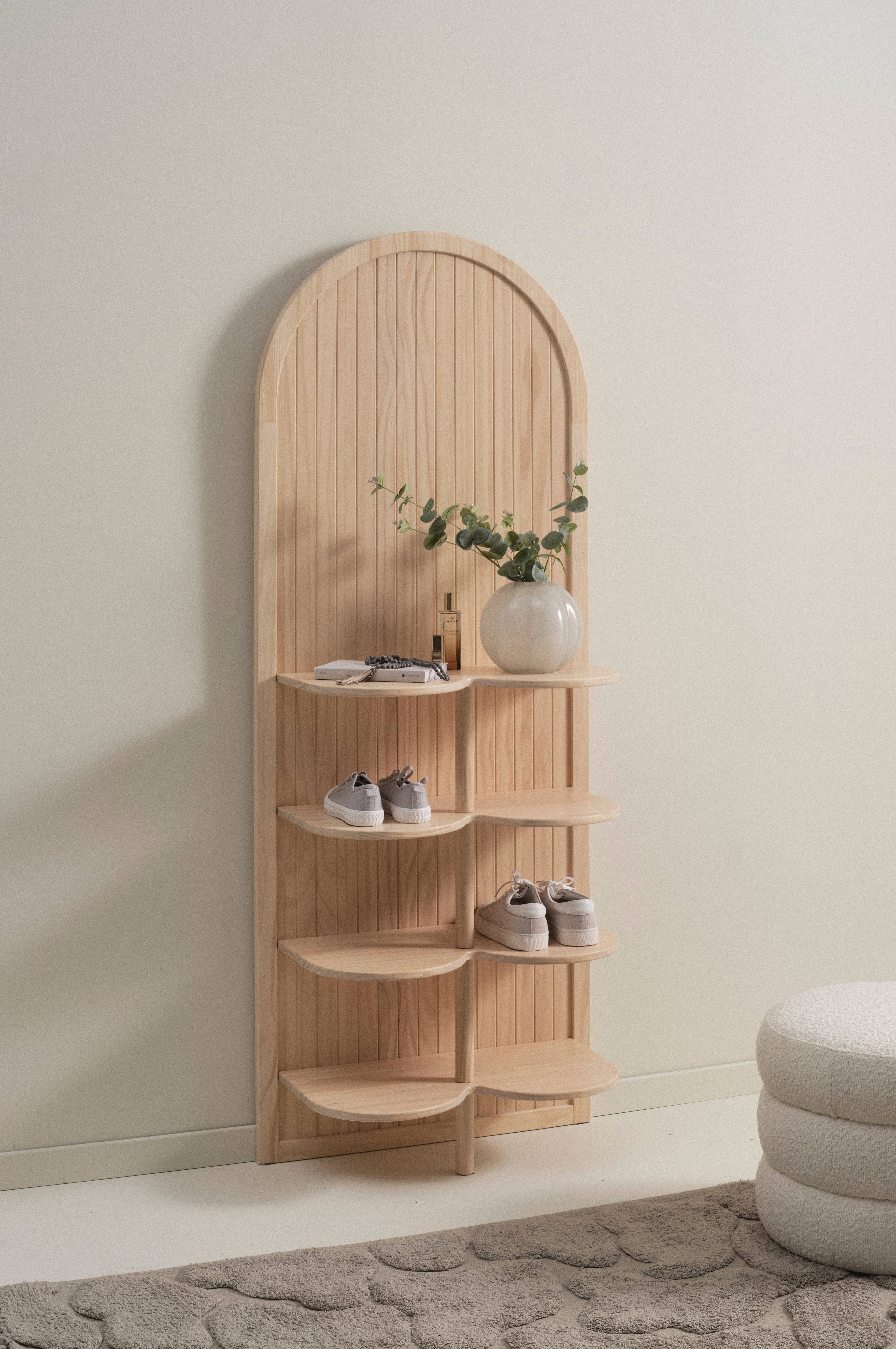 MAVI er væghængt entréopbevaring af massivt, FSC-certificeret fyrretræ behandlet med vandbaseret lak. De fire hylder har to afrundinger foran, en på hver side af midterstolpen. Tanken er, at hver hylde rummer to par sko, men du kan selvfølgelig opbevare en masse andet på hylderne. Den hvælvede ramme har en flot liste hele vejen rundt og en flot panelstribet struktur. Vægbeslag på bagsiden. Skal færdigsamles. Samlevejledning medfølger.