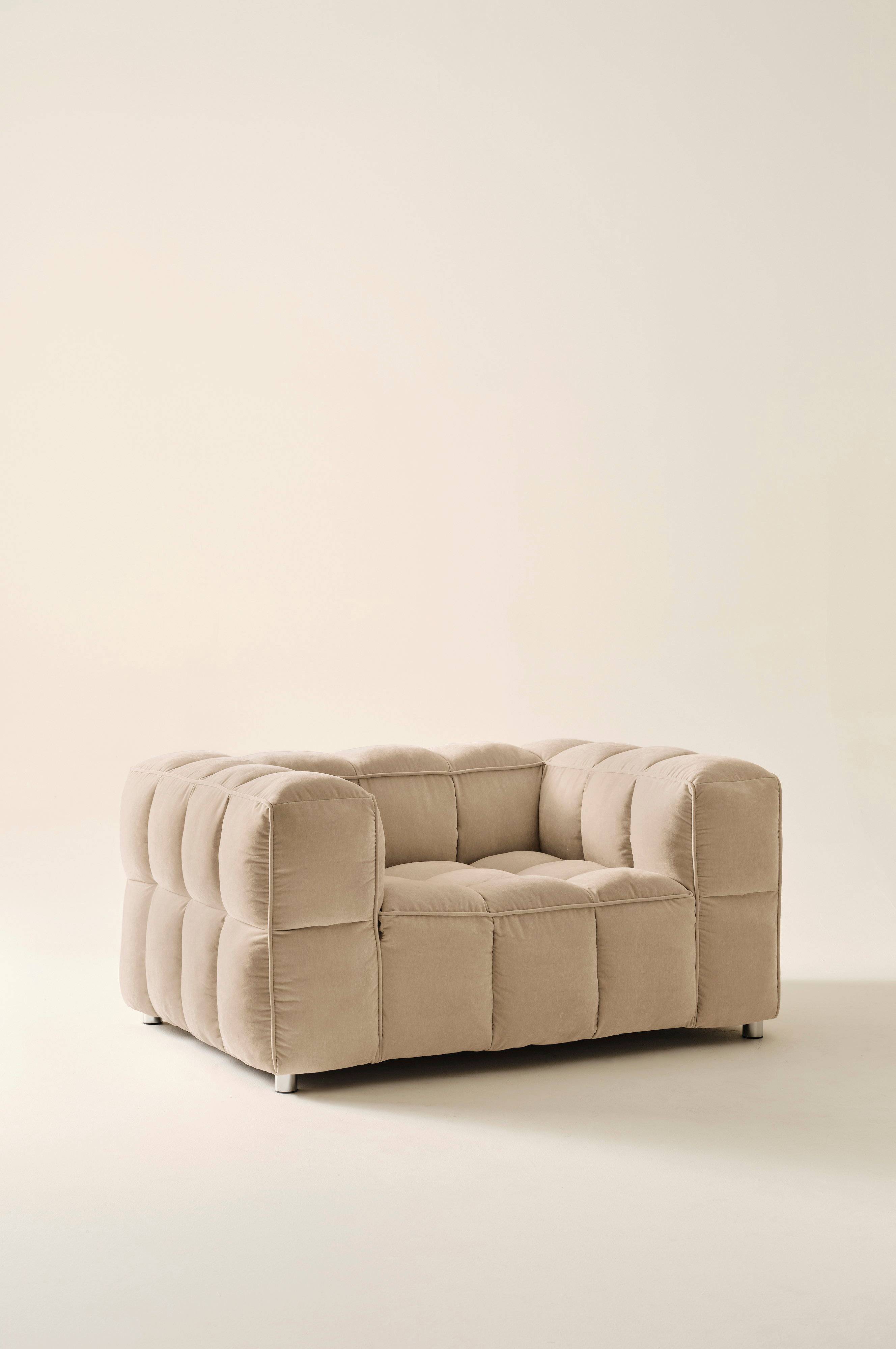 MEDFORD-lænestolen sætter et sjovt præg på din stue med sit quiltede, boblende look. Stolen er fremstillet af chenillestof af 50 % genbrugspolyester og er et blødt sted at slappe af. Betrækket er ikke aftageligt, hvilket sikrer et ensartet, elegant udseende. Den er en del af den alsidige MEDFORD-familie og passer perfekt sammen med matchende elementer for at fuldende dit rum. Perfekt til dem, der sætter pris på unikt, iøjnefaldende design.