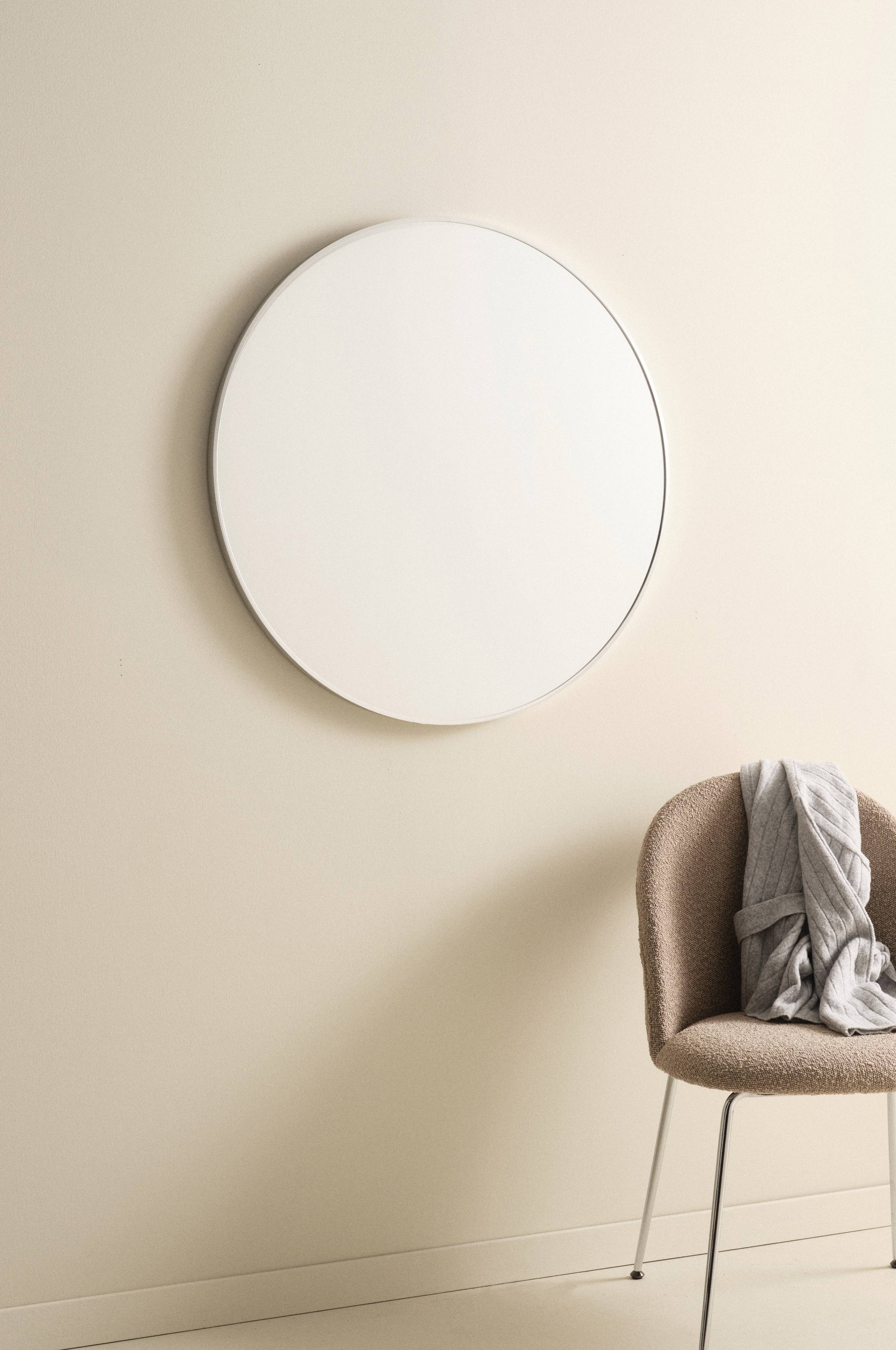Rundt spejl med flot aluminiumsramme. Bagsiden er af MDF. Skjult ophæng på bagsiden.