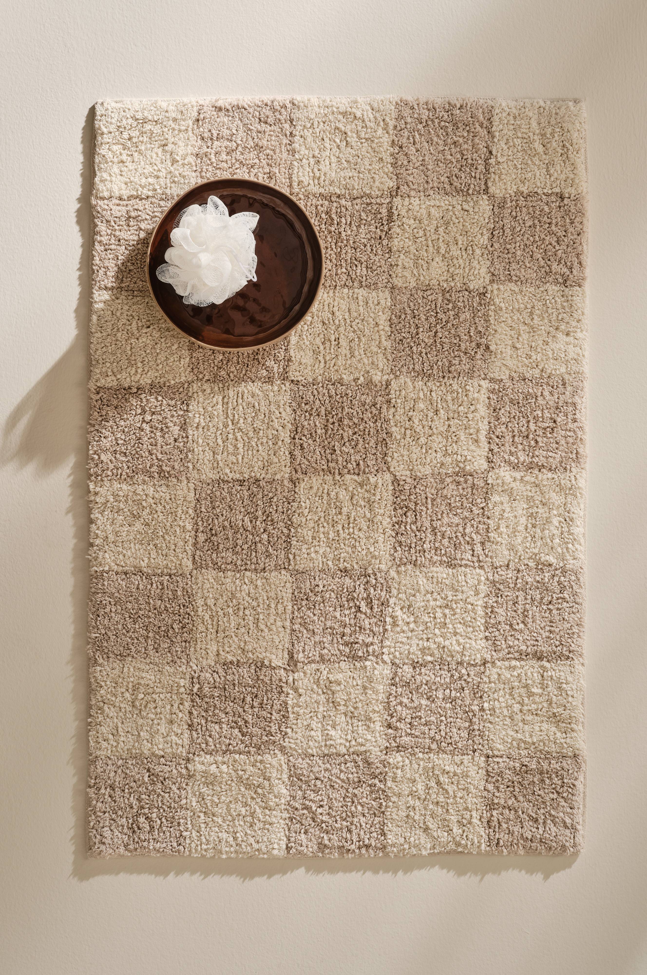 MELA er en tuftet badeværelsesmåtte med et ternet mønster af garnfarvede firkanter. Måtten er blød og behagelig under fødderne og giver dit badeværelse et varmt præg. Bagsiden med spray-latex sikrer, at tæppet bliver på plads.