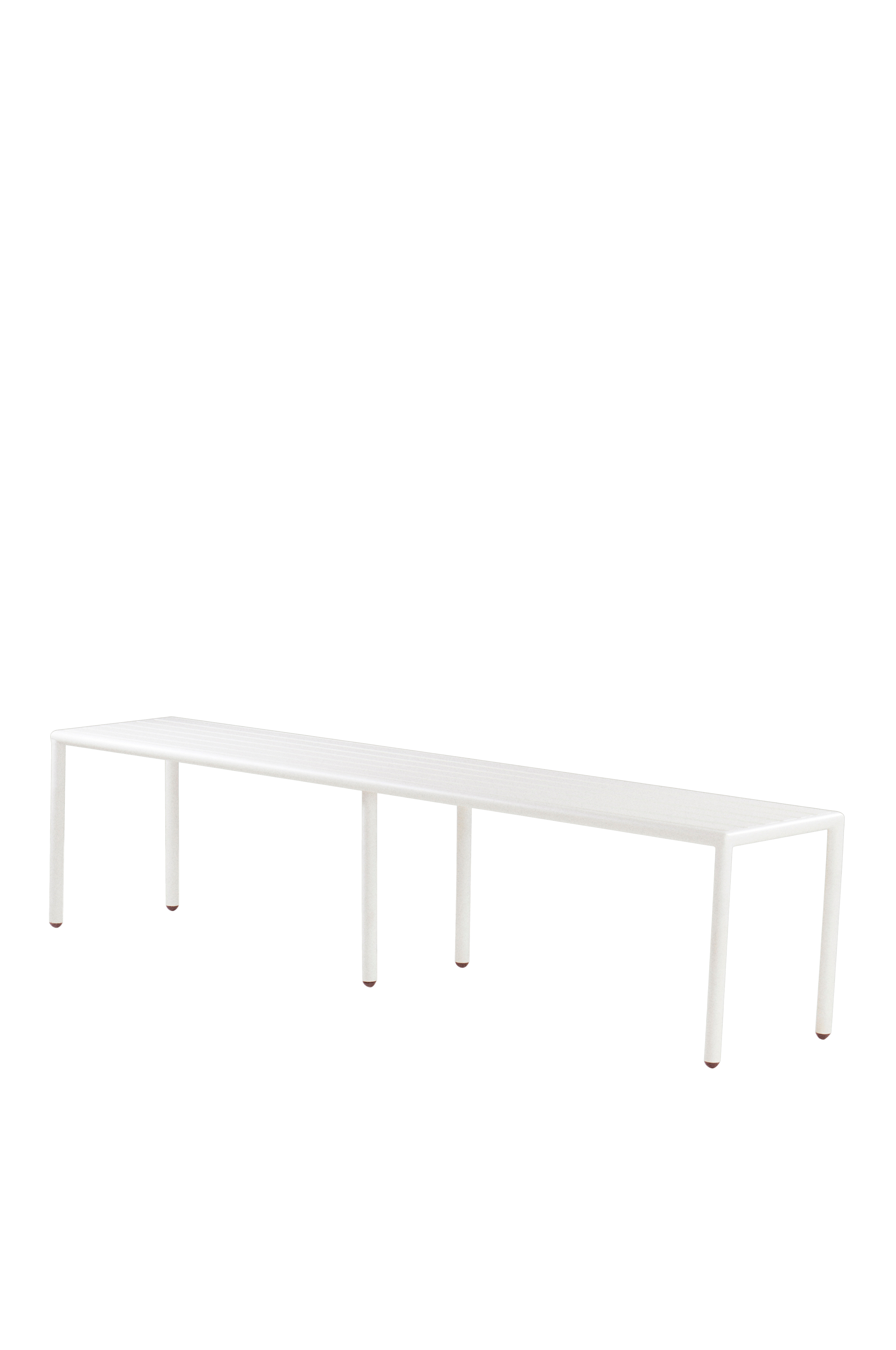 Bænk af pulverlakeret aluminium med mat overflade som ikke blænder i solskin. MENTON kan holde til at stå udendørs, og det gør udelivet lettere. Du slipper for at slæbe møbler rundt, når du vil sidde ude. Møblet er flot og nemt at placere i entreen, på balkonen eller altanen. Lav vægt.
