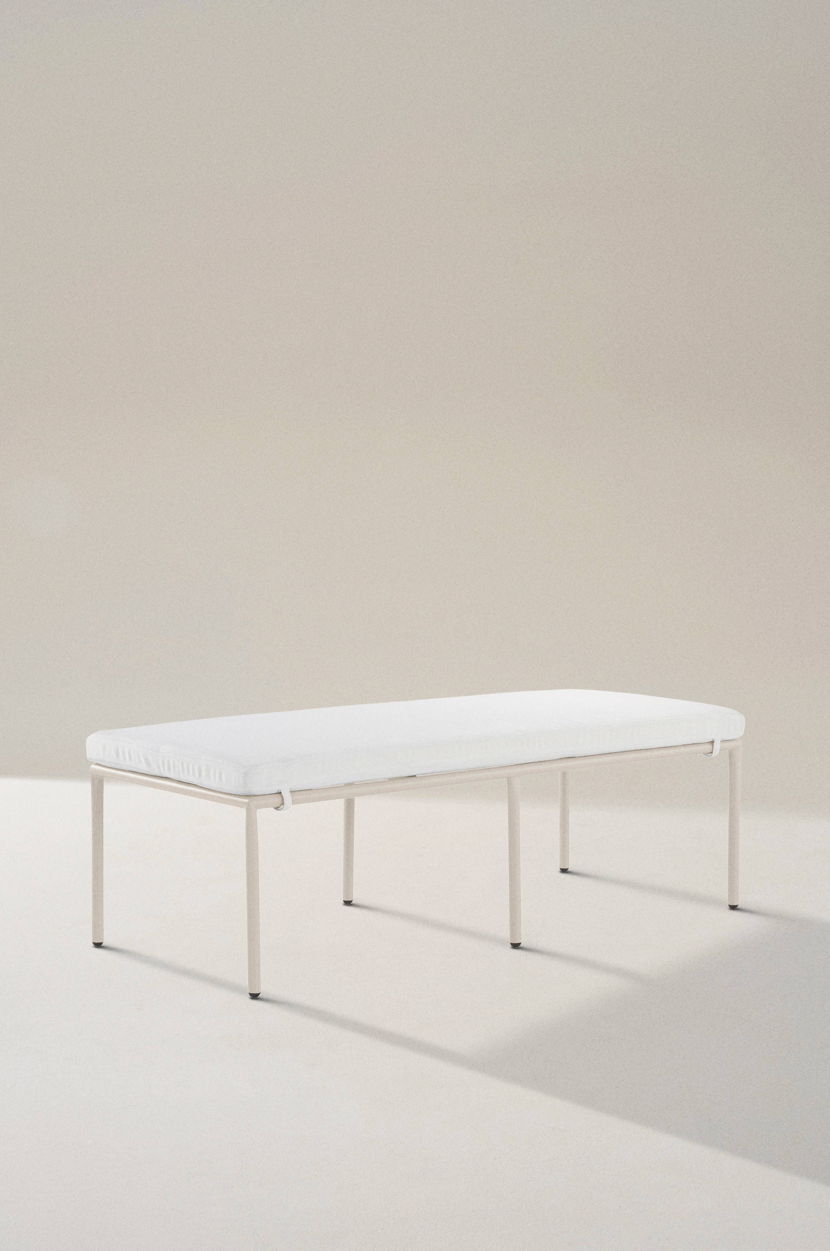 Daybed i pulverlakeret aluminium med mat finish. Sædehynde med polyesterbetræk og skum af skumgummi. Daybeden er perfekt at placere ved siden af sofaen i samme serie, så får man en stor, dejlig seng. MENTON kan placeres udendørs, aluminium ruster ikke. Kan stables til opbevaring. Lav vægt.