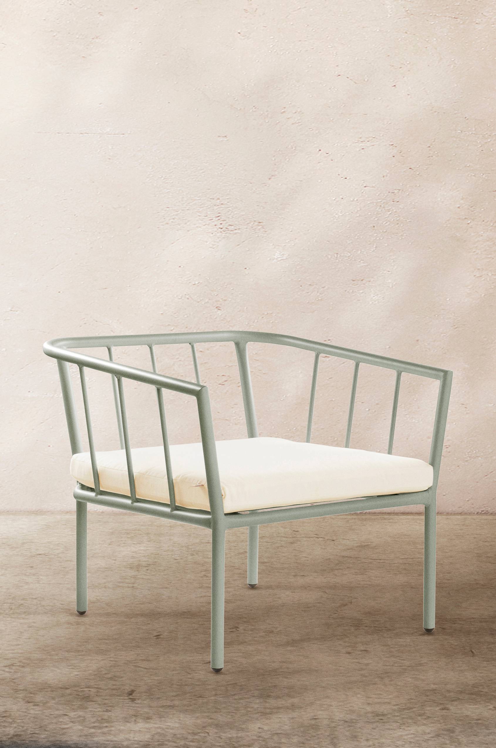 Lænestol af pulverlakeret aluminium med en mat finish, der ikke blænder i sollyset. Sædehynde med polyesterbetræk og skumpolstring. MENTON kan stå ude og gør udelivet lettere, for aluminium ruster ikke. Du behøver ikke at bære, så snart du vil sidde ude. Møblerne er pæne og giver den rette loungefølelse.