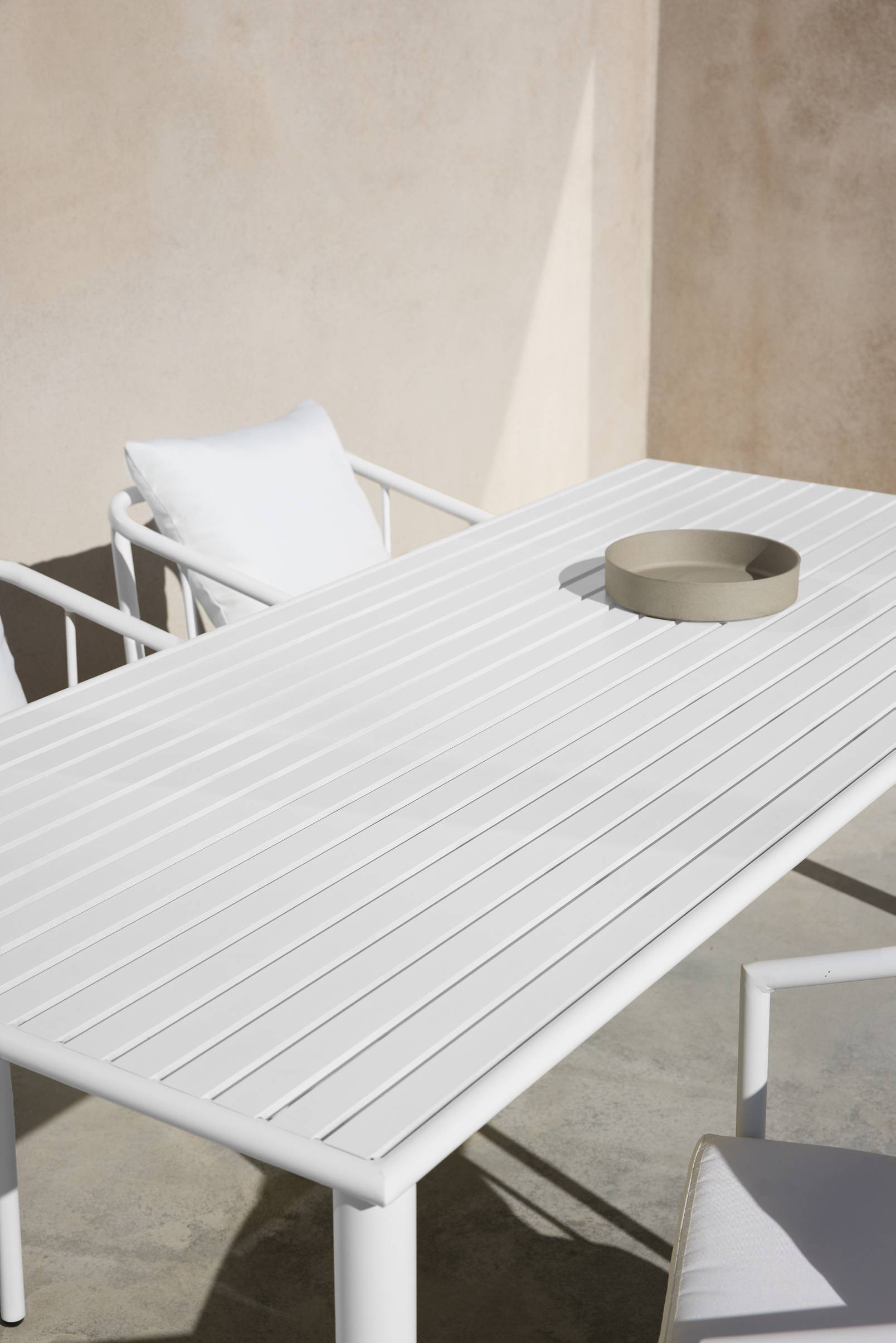 Spisebord i pulverlakeret aluminium med en mat finish, der ikke blænder i sollyset. MENTON kan stå udendørs, og det gør udelivet lettere. Du behøver ikke at bære, så snart du vil sidde udenfor. Møblerne er pæne og giver en god fornemmelse på terrassen eller gårdspladsen. Lav vægt.