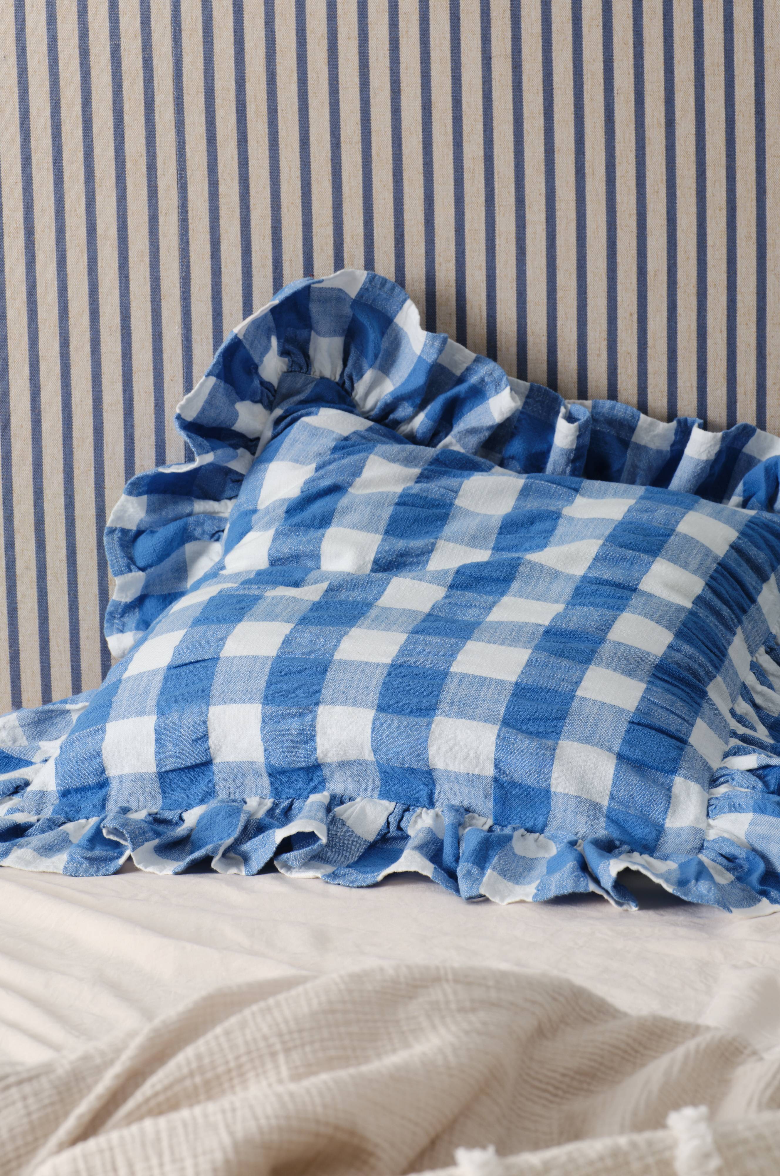 MIMMI-pudebetrækket har et garnfarvet ternet mønster og er fremstillet af bomuldsseersucker. Pudebetrækket har en flæsekant hele vejen rundt og et klassisk ternet mønster. Skjult matchende lynlås på bagsiden.