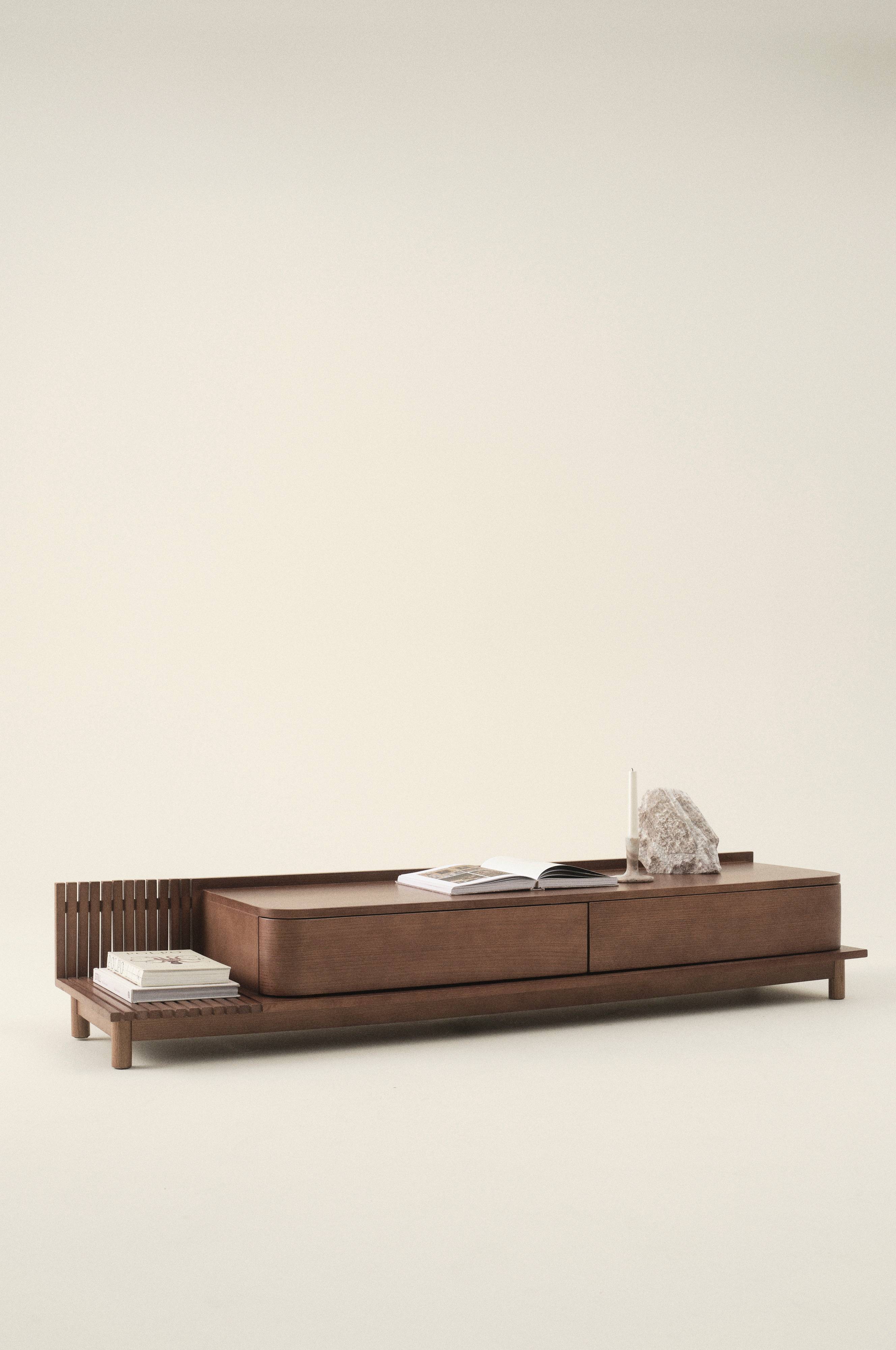 Tv-bænk af massiv eg i kombination med MDF med matchende egetræsfiner. Det lave møbel er i et stilrent design med afrundede hjørner og bløde linjer, der kan lede tankerne hen på den japanske stil. Tv-bænken har to skuffer og en lille sidehylde til praktisk opbevaring. Der er fem runde lige egetræsben. Møblet er behandlet med vandbaseret lak. Skal færdigsamles. Samlevejledning medfølger.