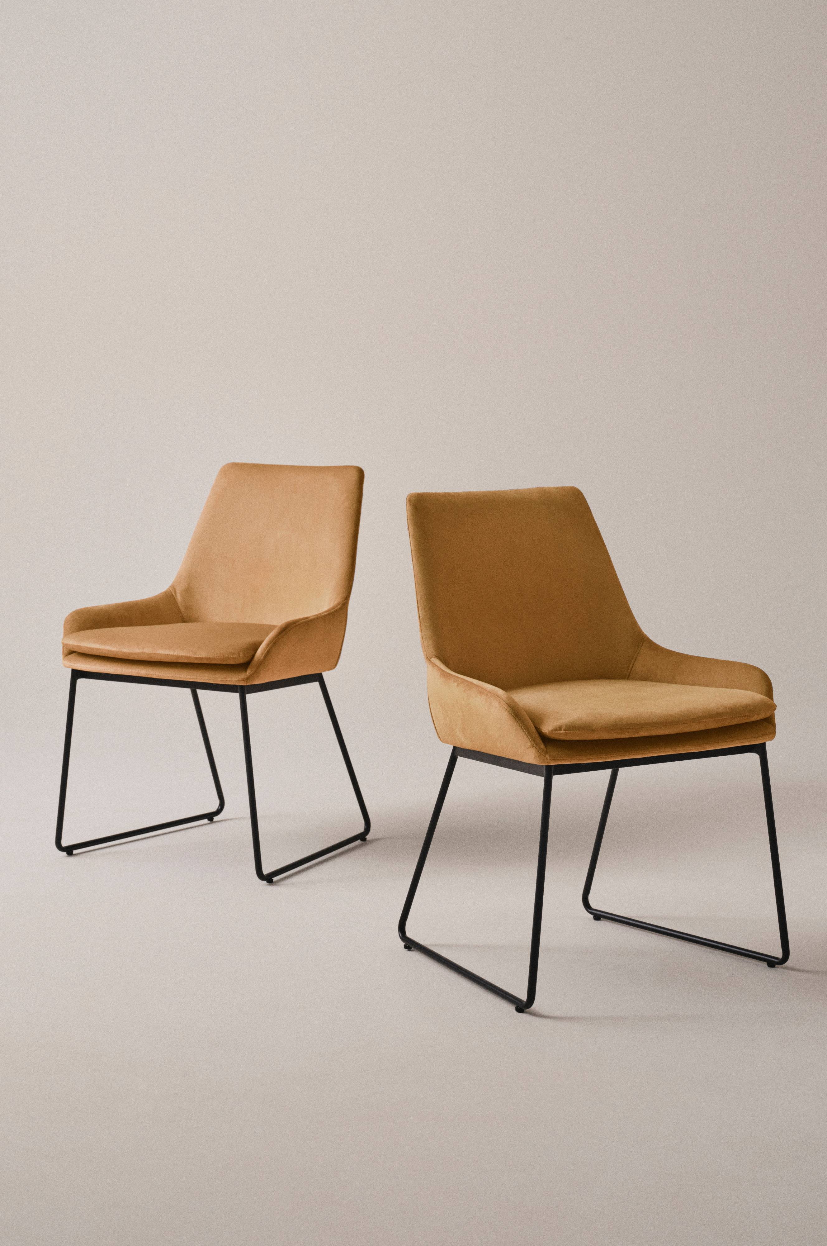 2-pak stol med velourbetræk som giver et luksuriøst og indbydende look. Sider og ryg er blødt polstret og stolen har en løs siddehynde. Benene er i rustfrit stål i messingfarvet eller sort pulverlakering. Den stilrene form betyder at stolen passer ind i de fleste hjem og i mange forskellige rum. Stoffets slidstyrke er på 28.000 Martindale. Skal færdigsamles. Samlevejledning medfølger.