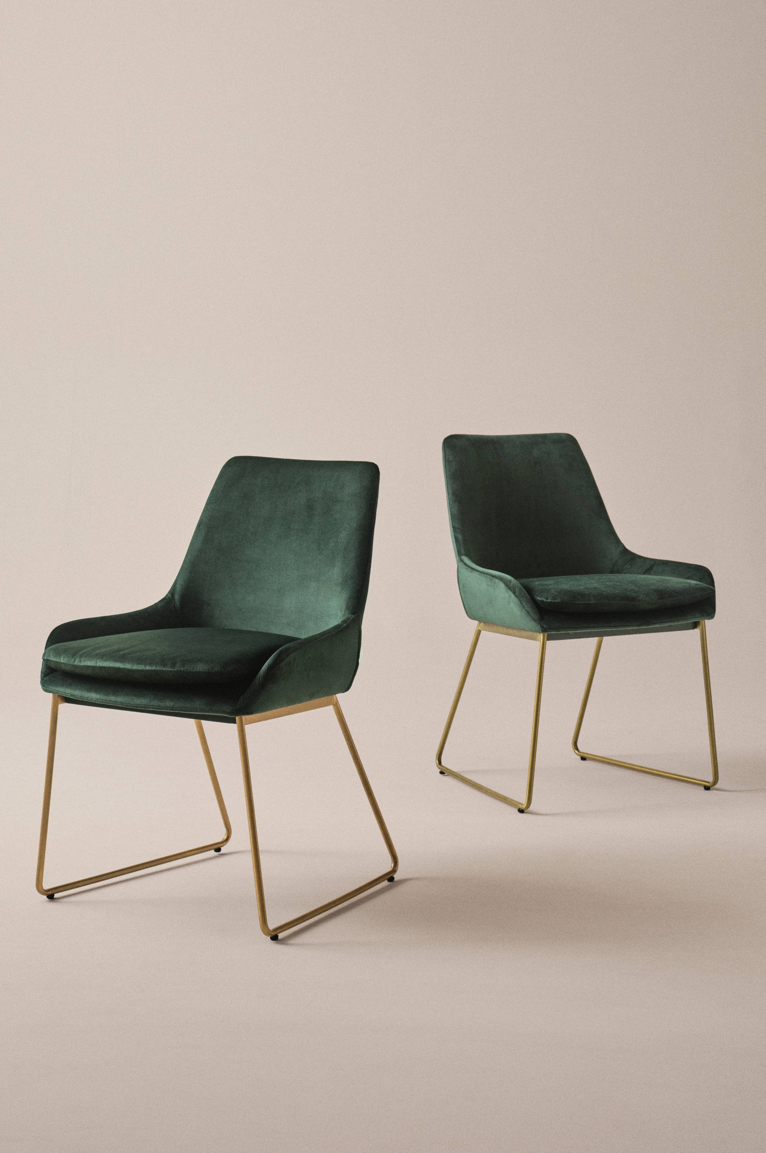 2-pak stol med velourbetræk som giver et luksuriøst og indbydende look. Sider og ryg er blødt polstret og stolen har en løs siddehynde. Benene er i rustfrit stål i messingfarvet eller sort pulverlakering. Den stilrene form betyder at stolen passer ind i de fleste hjem og i mange forskellige rum. Stoffets slidstyrke er på 28.000 Martindale. Skal færdigsamles. Samlevejledning medfølger.