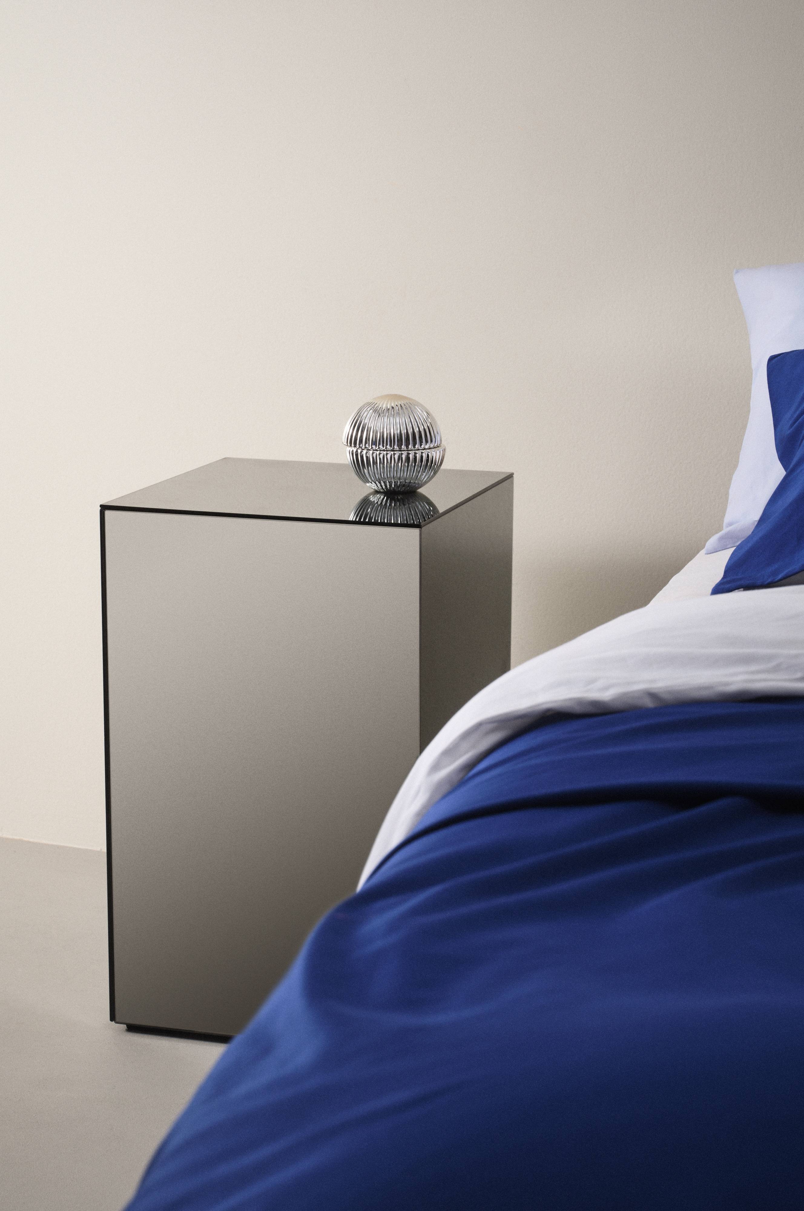 Sengebord af spejlglas med ramme af FSC-certificeret MDF. Finessen ved dette sengebord er, at det har et skjult skab bag et af spejlene. Lågen har push-funktion og soft close-hængsler. Indvendigt er skabet sort med en fast hylde. Sengebordet er dækket af spejle på alle sider og kanterne er matsorte. Bordet er nemt at placere mange forskellige steder i hjemmet udover at være et ekstraordinært sengebord.