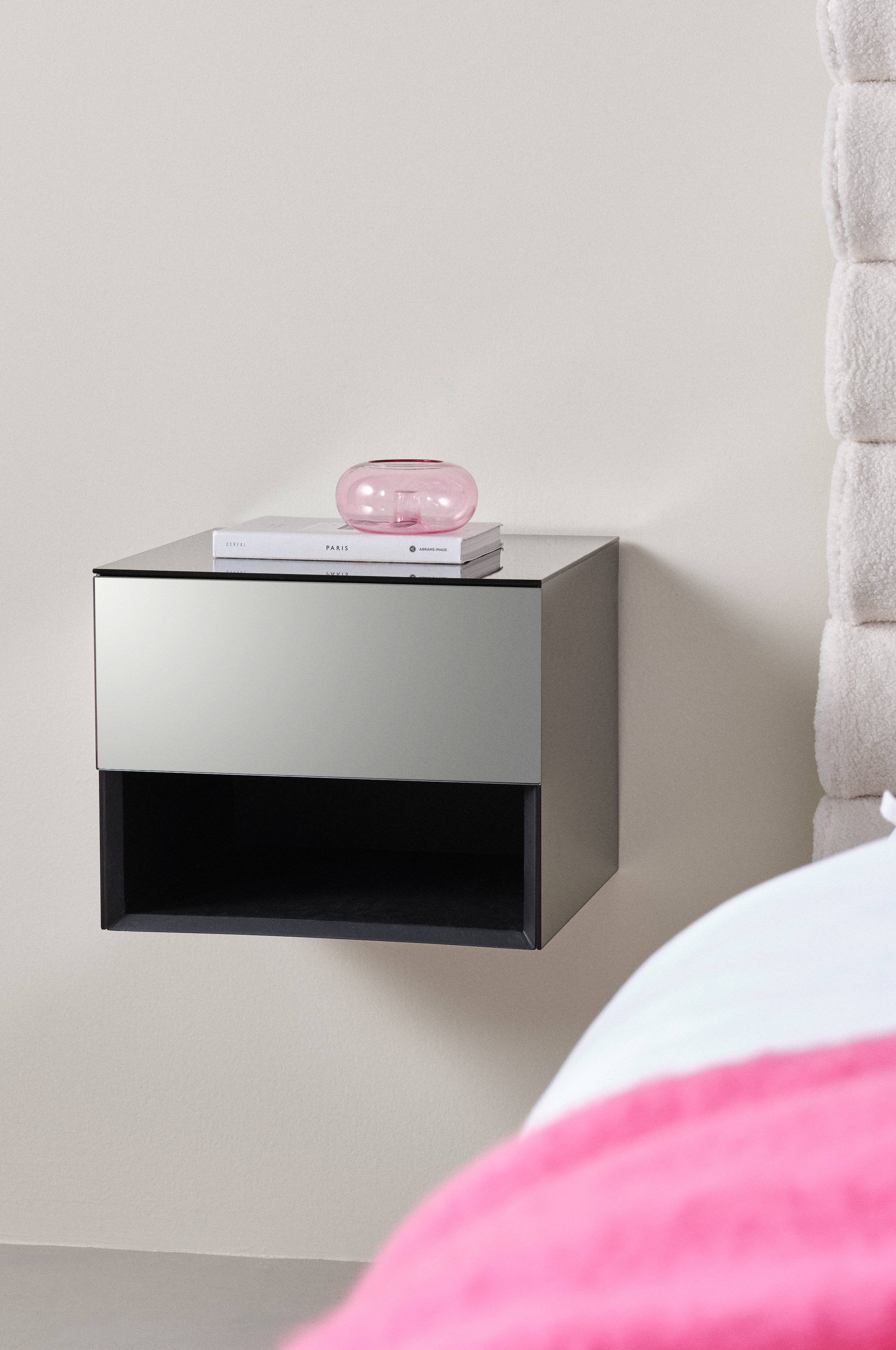 Sengebord af spejlglas med ramme af FSC-certificeret MDF. Dette sengebord er beregnet til at hænge på væggen. Bag spejlet foran er der et skjult skab og derunder en åben hylde. Lågen har push-funktion og soft close-hængsler. Indvendigt er skabet sort. Sengebordet er dækket af spejle på alle sider og kanterne er matsorte. Bordet er nemt at placere mange forskellige steder i hjemmet udover at være et ekstraordinært sengebord.