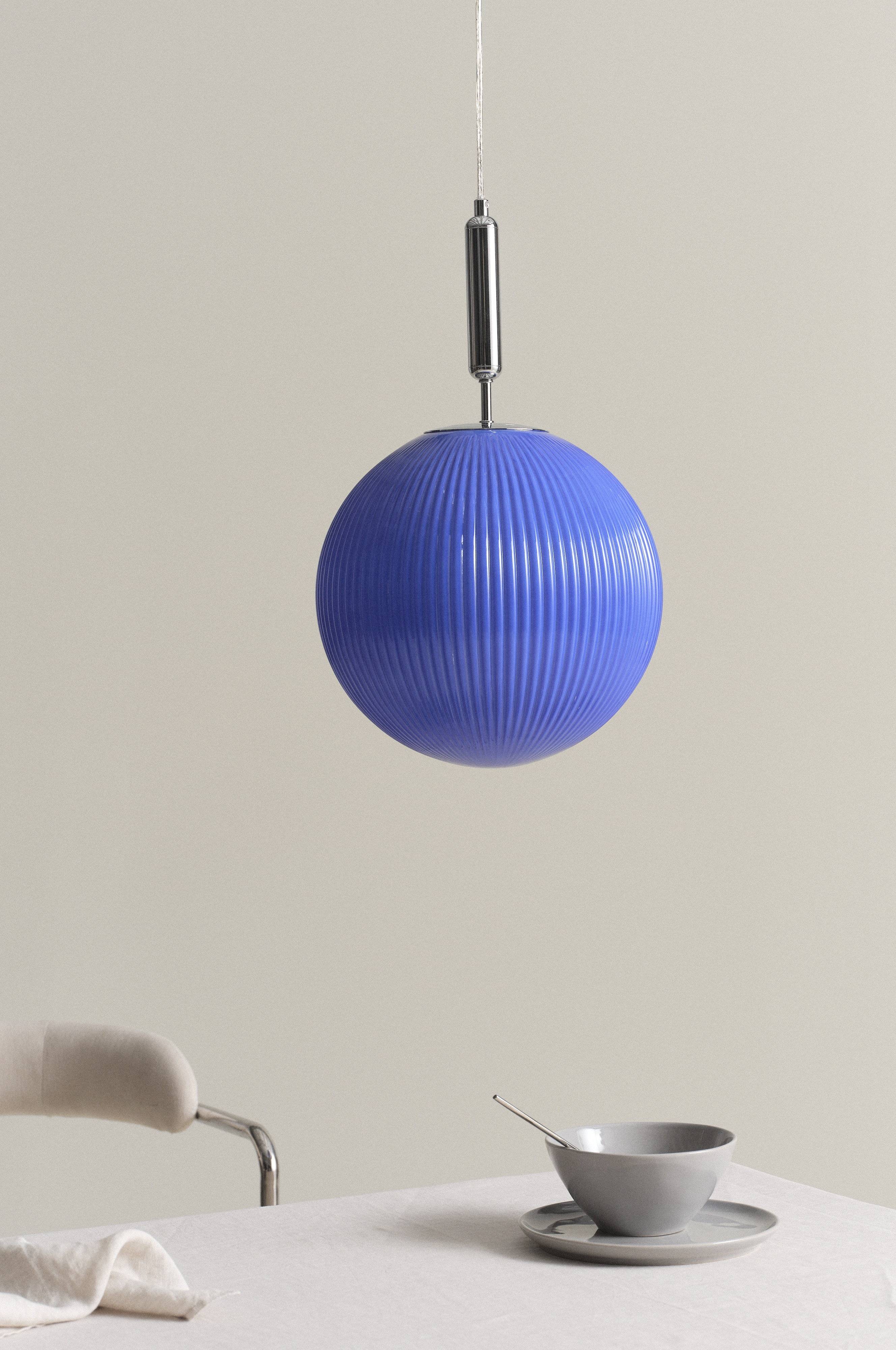 Loftlampe med smuk, rund glaskuppel som har effektfulde reliefstriber. Den klare blå farve skinner flot når du tænder lampen og den er meget dekorativ, selv når den er slukket. Lampens holder og baldakin er af jern i kromfarve. Ledningen er transparent. Lampen er jordet, klasse 1. På grund af EU-regler kræves en separat loftkontakt i visse lande. Loftkontakten skal være jordet (klasse 1) og købes separat.