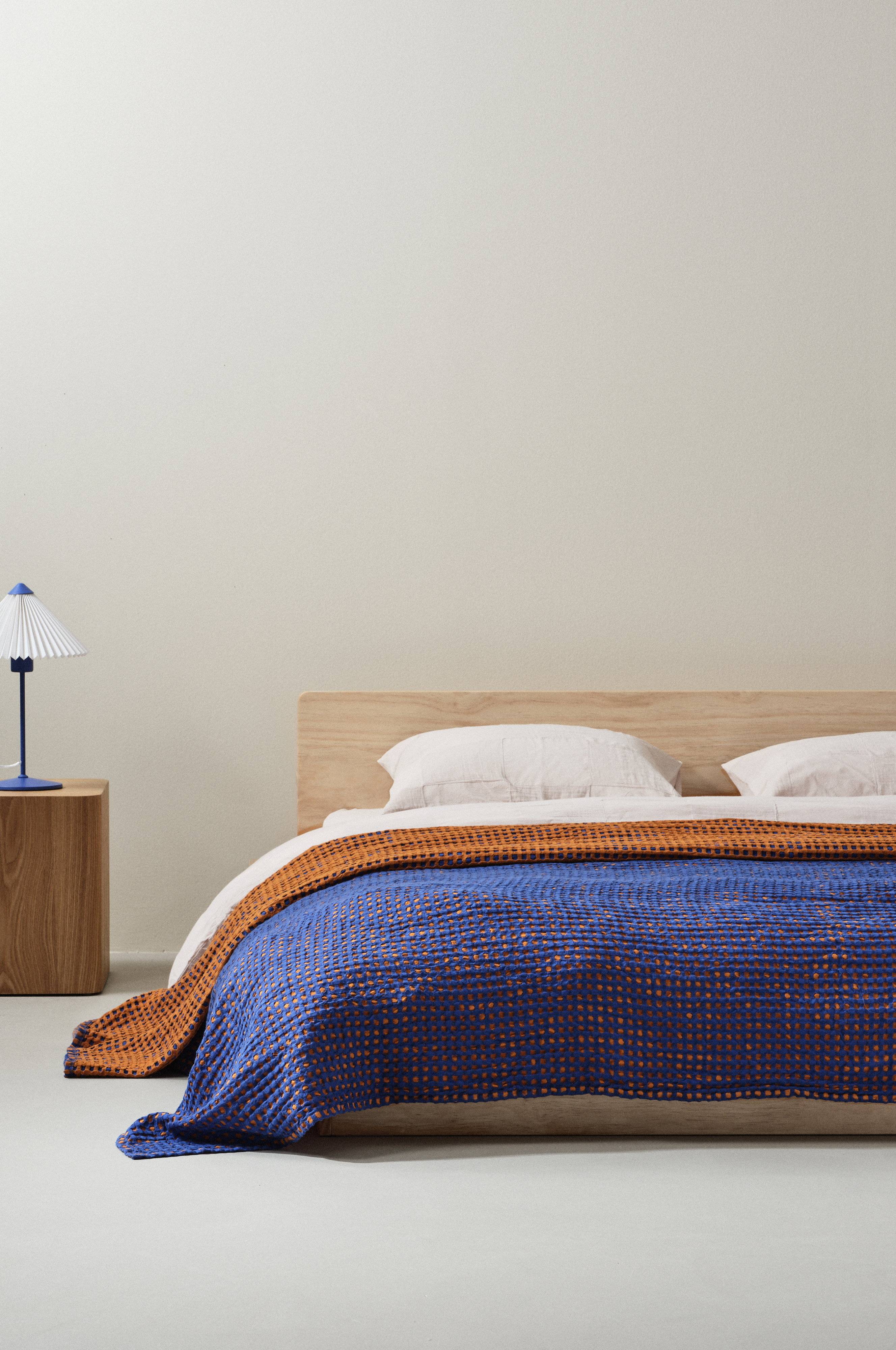Sengetæppe i behagelig bomuldskvalitet, der er stykvasket, hvilket gør det ekstra blødt. Sengetæppet er smidigt og let at rede op med. Det garnfarvede mønster med tern som opstår grundet den specielle væveteknik er effektfuldt og stoffet får en vaflet struktur. Kanten rundt om er sømmet. Stoffets gramvægt er 140 g/m².