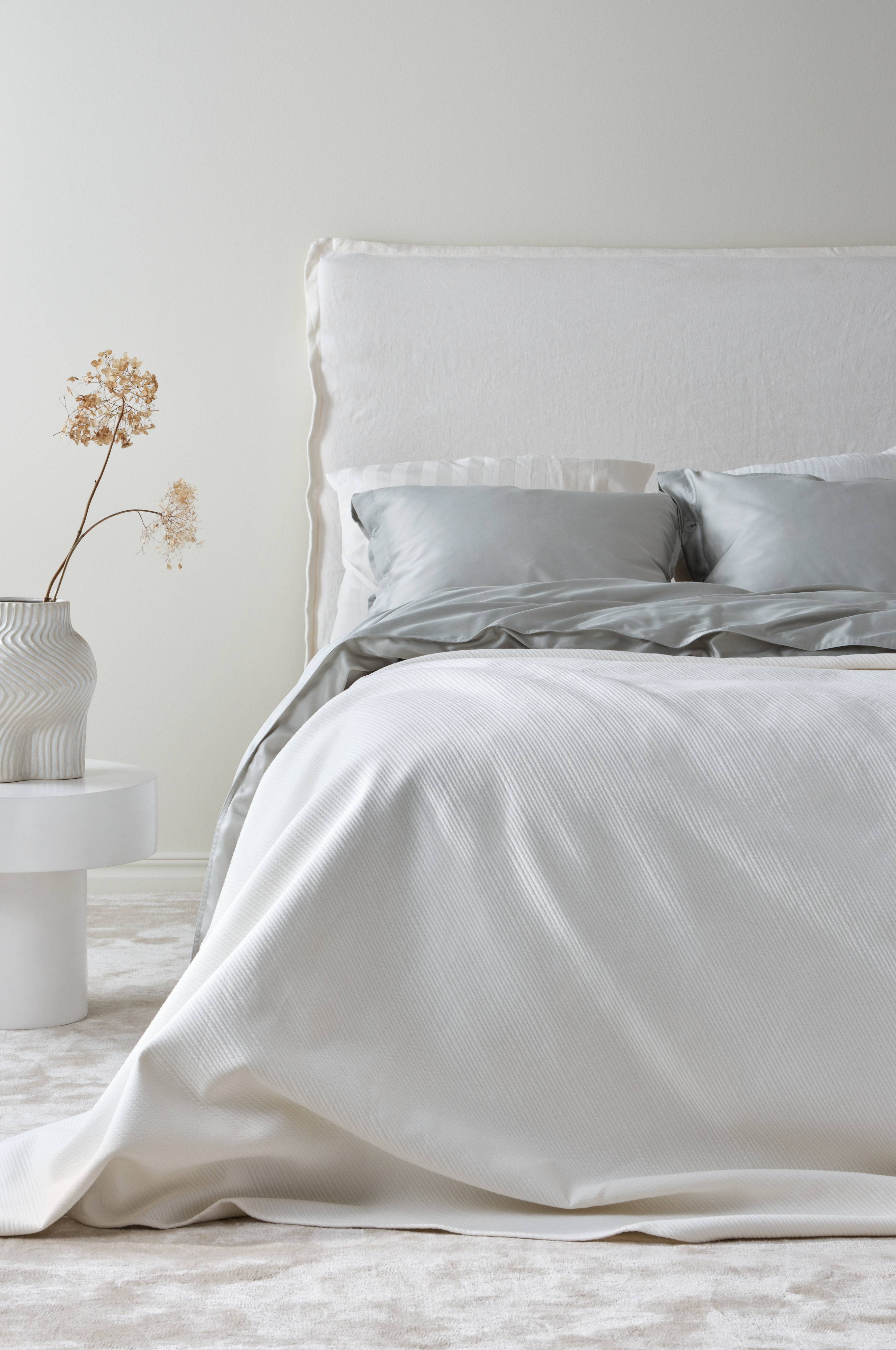 Sengetæppe til dobbeltseng. MOON er et smidigt, strikket sengetæppe som i sin enkelthed giver en klassisk og skønt redt seng. Vævningen giver et diagonalt ternet mønster tone-i-tone med diskret struktur. Det behagelige bomuldsstof har en gramvægt på 440 g/m². Det er rigtig behageligt at tage en lille lur ovenpå sengetæppet. Pudebetræk medfølger ikke, købes separat.