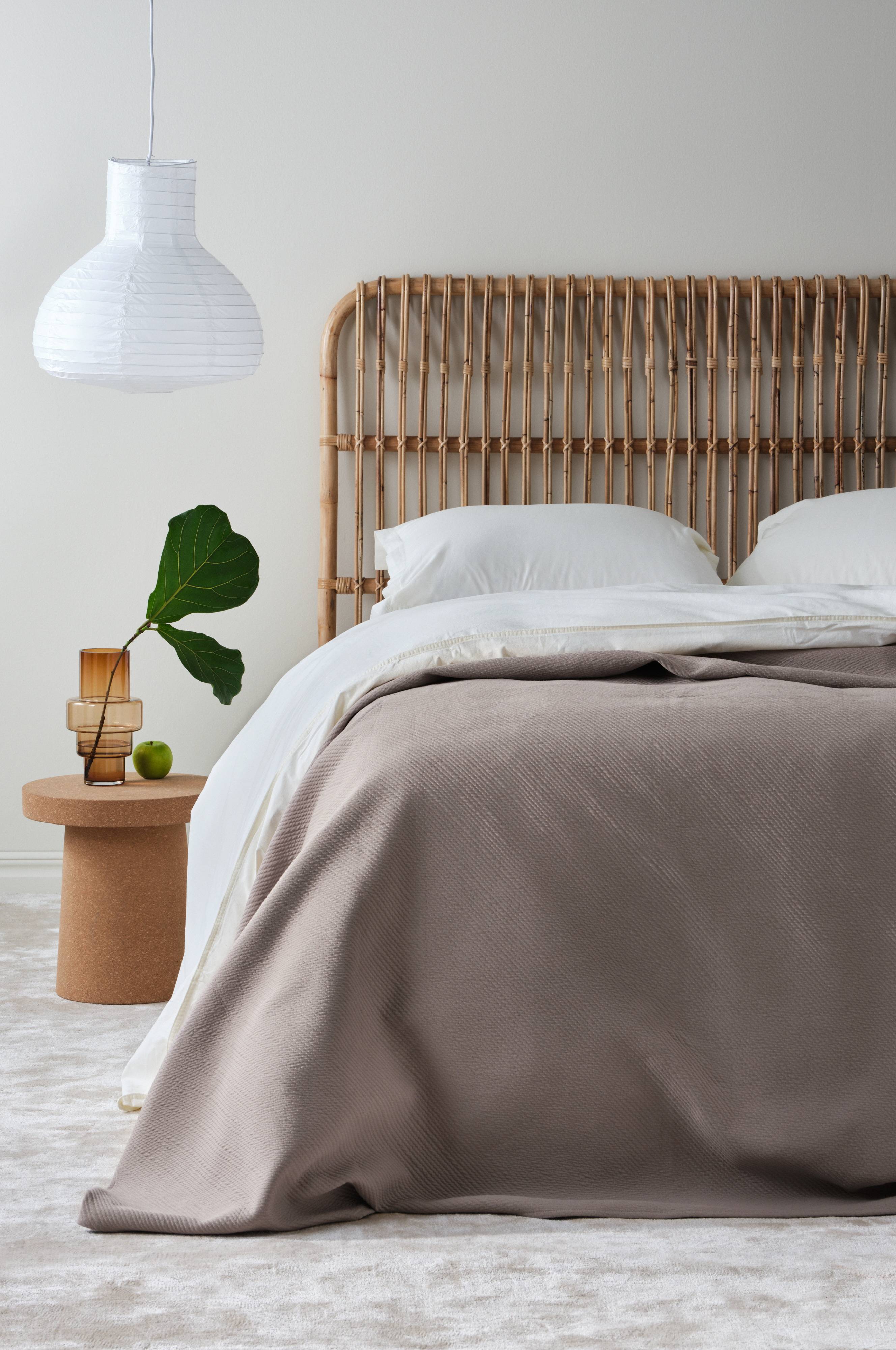 Sengetæppe til dobbeltseng. MOON er et smidigt, strikket sengetæppe som i sin enkelthed giver en klassisk og skønt redt seng. Vævningen giver et diagonalt ternet mønster tone-i-tone med diskret struktur. Det behagelige bomuldsstof har en gramvægt på 440 g/m². Det er rigtig behageligt at tage en lille lur ovenpå sengetæppet. Pudebetræk medfølger ikke, købes separat.