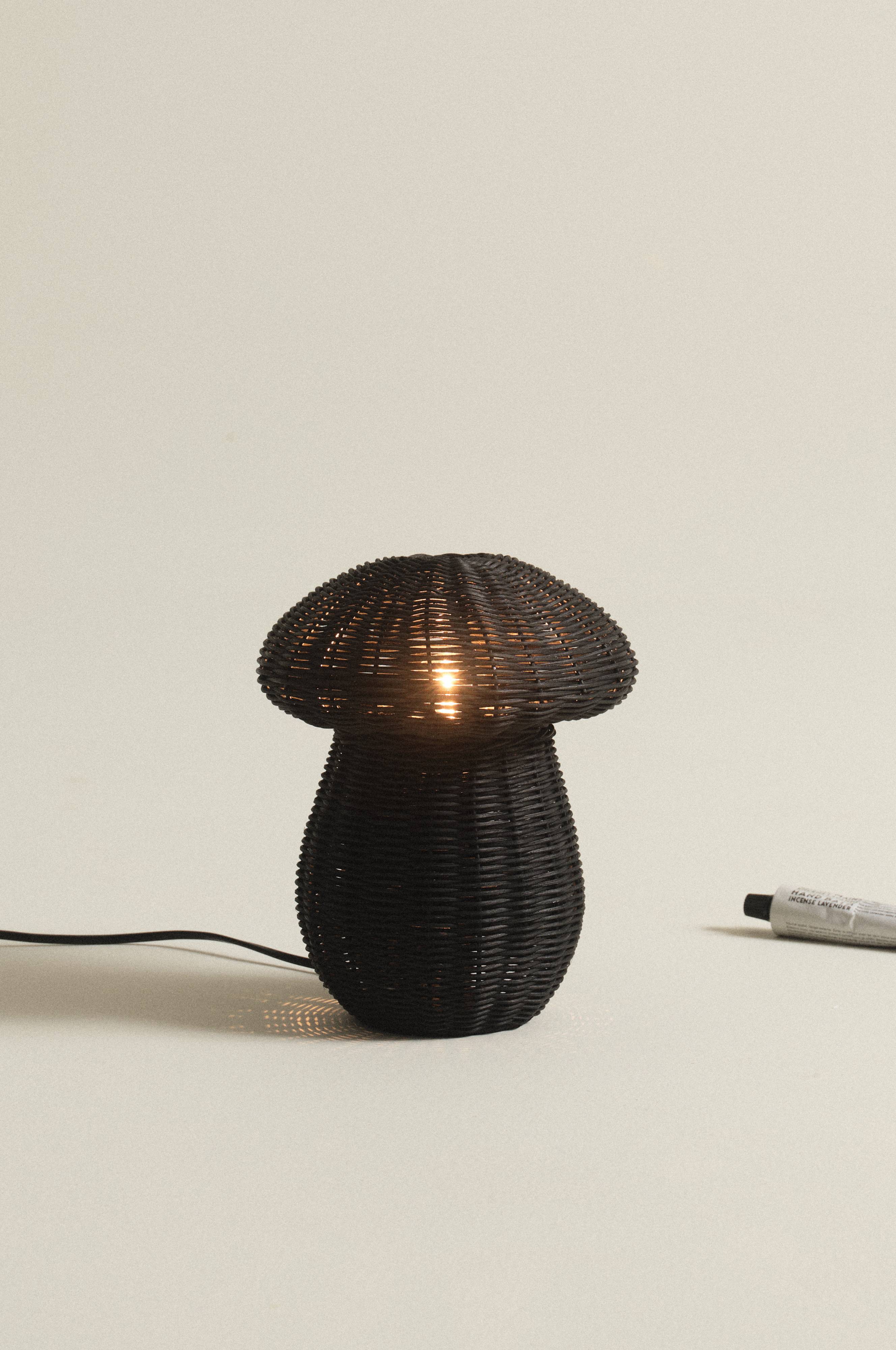 Bordlampe af naturlig rotting med stel af metal. MUSH er formet som en svamp og den flettede rotting giver et hyggeligt og varmt skær. Sort ledning. Lampen er ujordet, klasse 2.