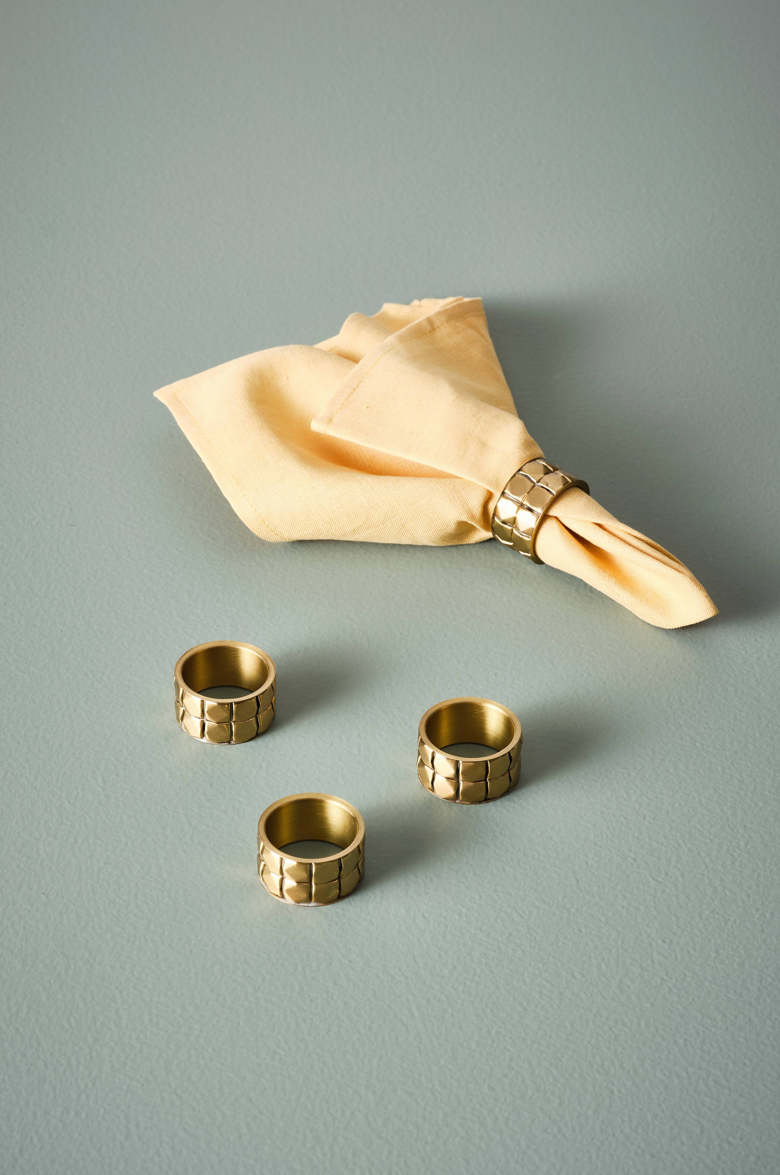 4-pak servietringe af messing med dekorativt reliefmønster.