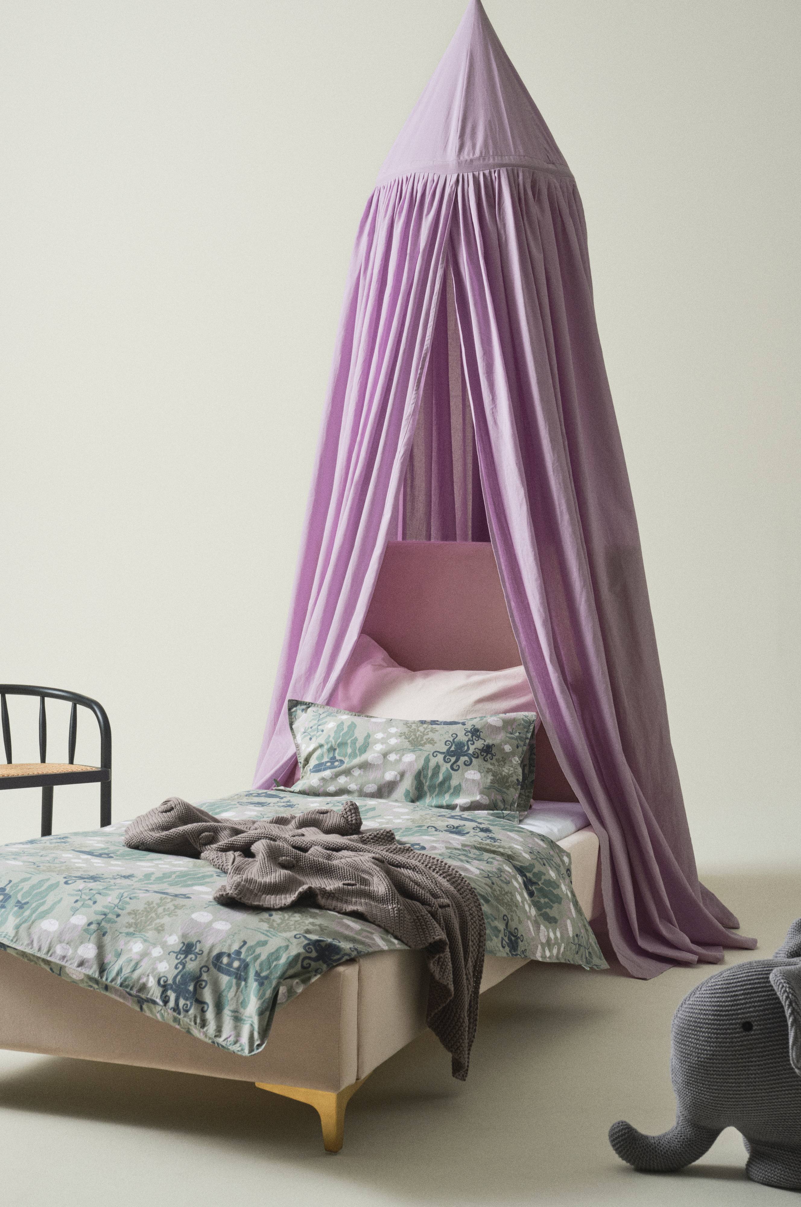 Sengehimmel fremstillet i vasket økologisk bomuldskvalitet. Bomuldsgarnet er af en grovere type og giver stoffet et eksklusivt look og et høragtigt udtryk. Denne sengehimmel er åben både foran og bagpå, hvilket er en fordel, hvis du vil have en sengelampe på væggen bag sengen. Hæng sengehimlen op i børneværelset over børnesengen for at skabe en hyggelig og indbydende atmosfære.