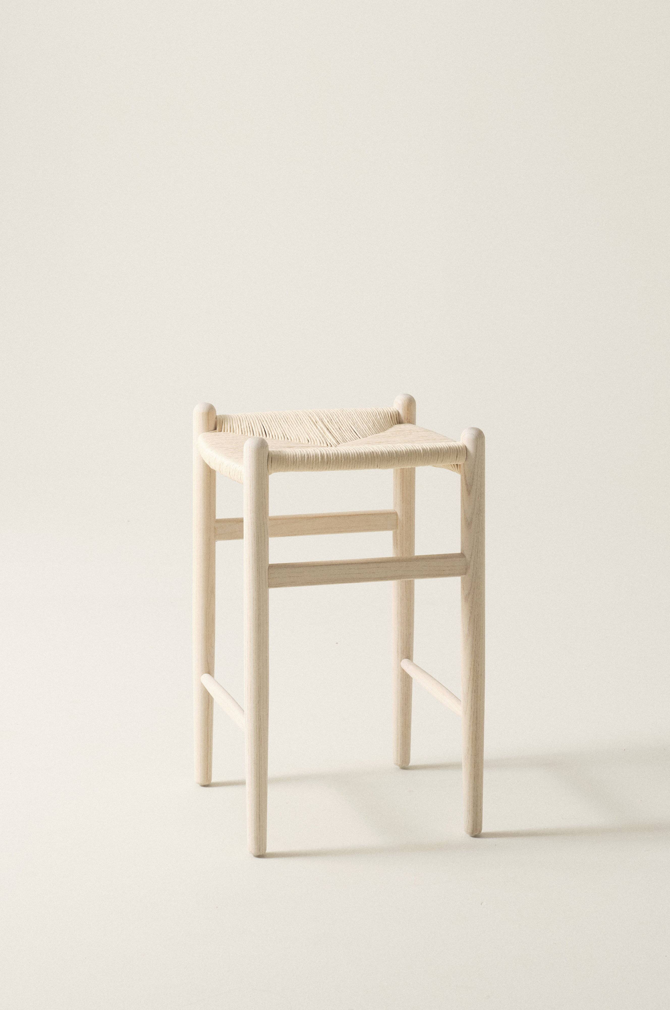 Høj taburet i massiv birk med sæde af flettede papirsnore, som giver en flot kontrast og giver god siddekomfort.