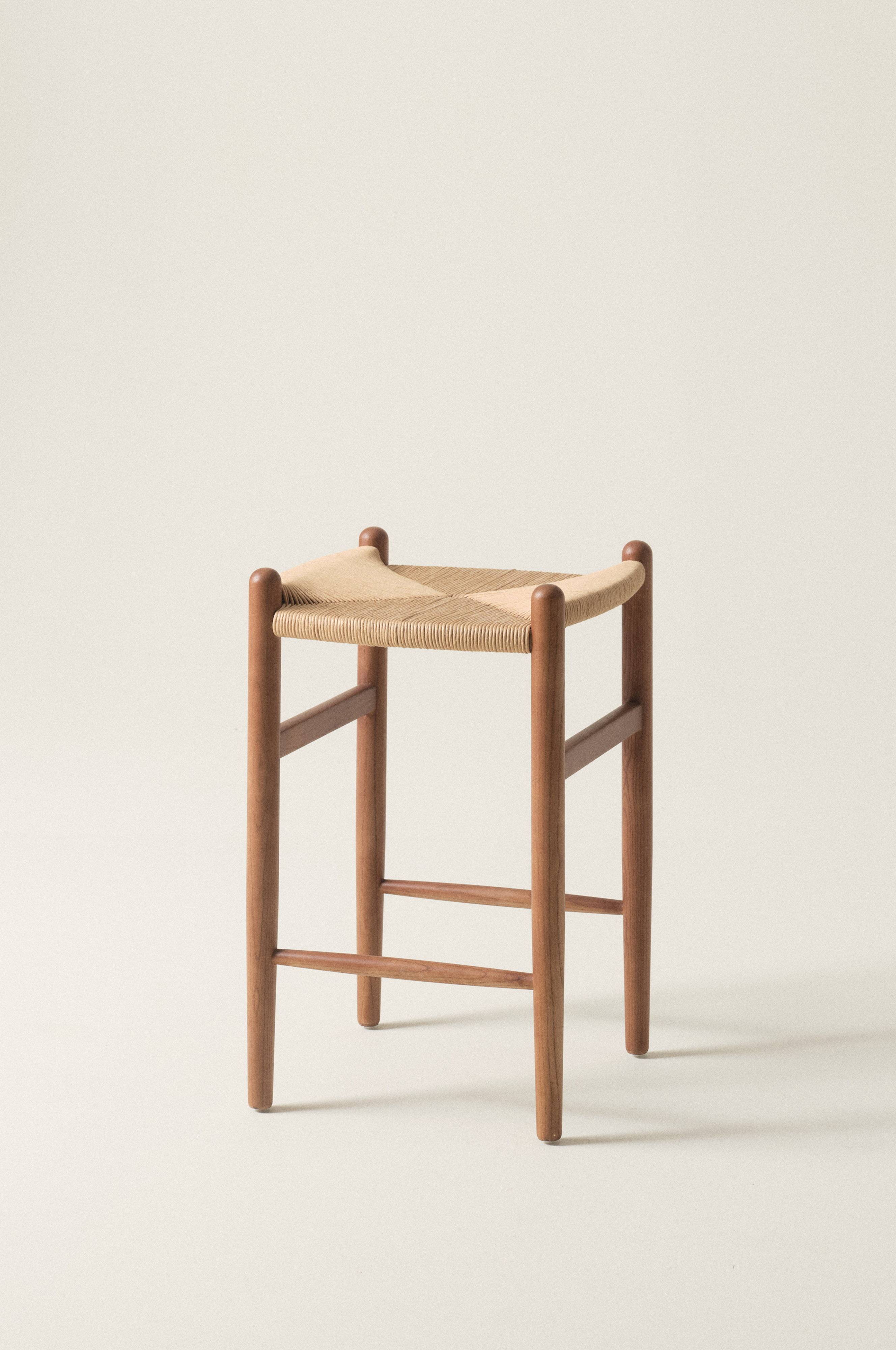 Høj taburet i massiv birk med sæde af flettede papirsnore, som giver en flot kontrast og giver god siddekomfort.