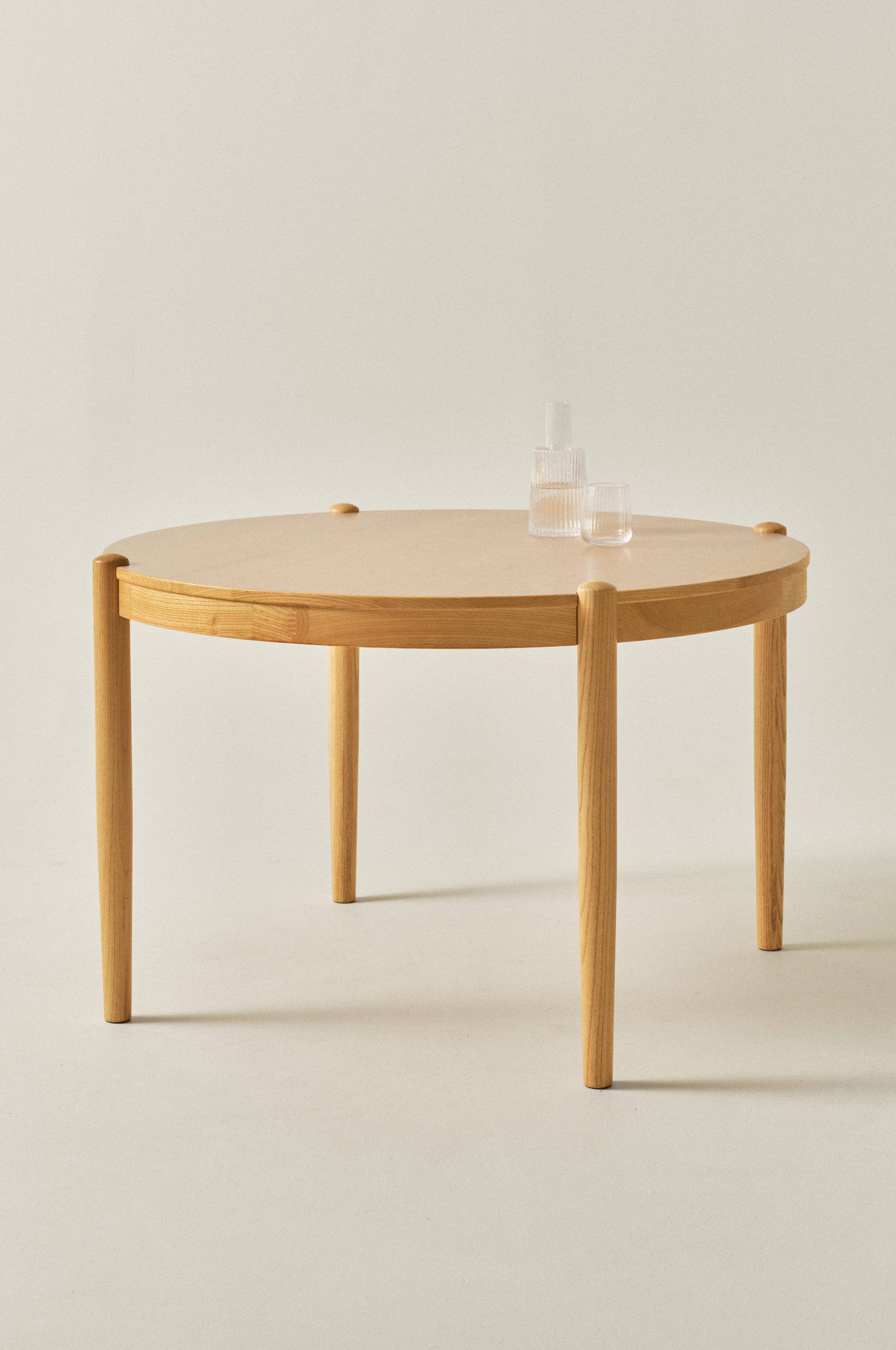 Spisebordet er lavet af elmetræ og bordpladen har elmefiner ovenpå. Spisebordet er rundt i formen og benene, som er placeret i yderkanten og samtidig forsænket i bordpladen, giver bordet dens fine karakter. Bordet fås med flere forskellige flotte overfladebehandlinger, vælg den farve der passer bedst til dit hjem.