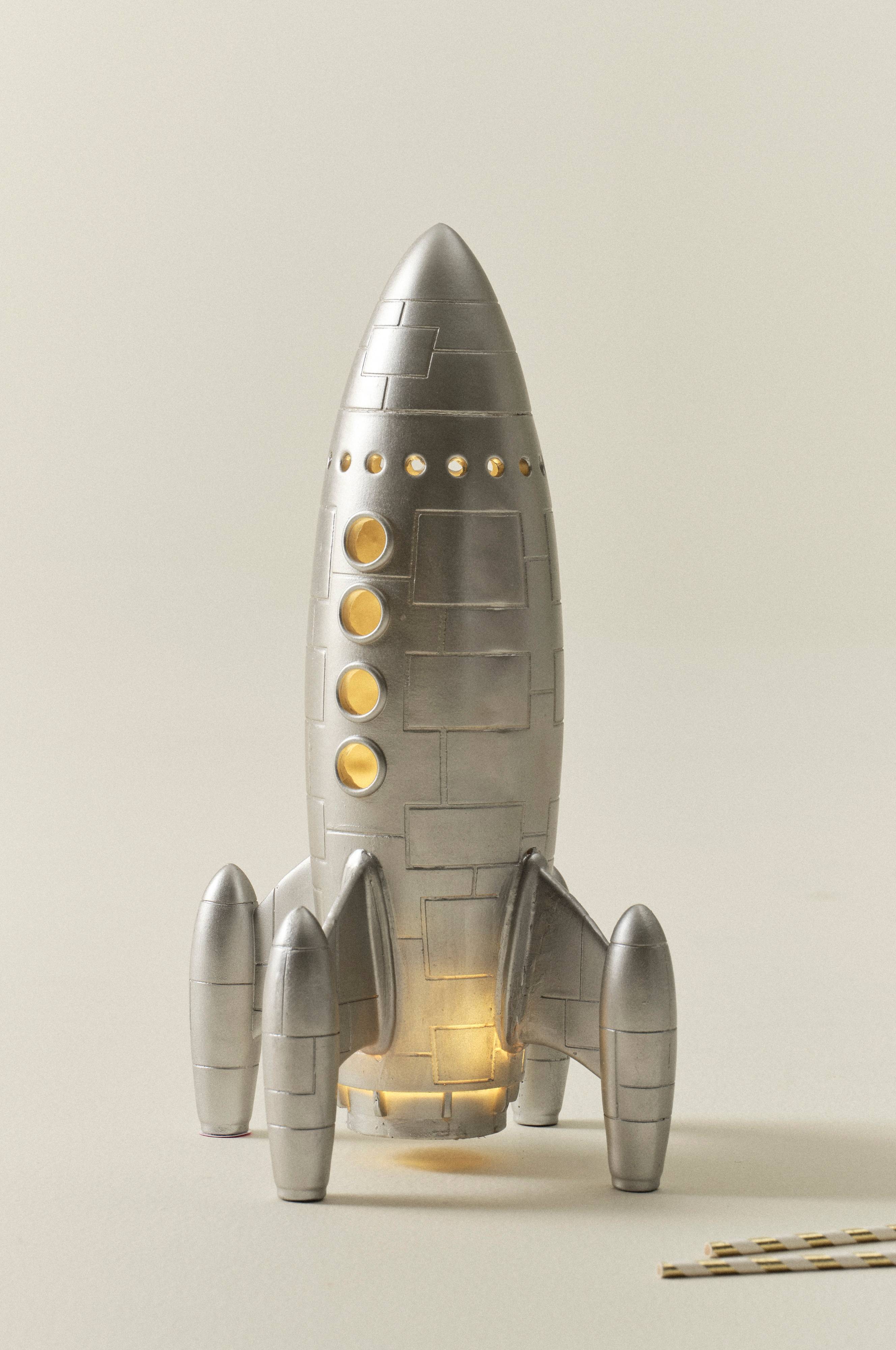 Rumraket af polyresin med LED-belysning. Når raketten lyser ser den dejligt indbydende ud og er en perfekt natlampe. Lille afbryder under raketten.