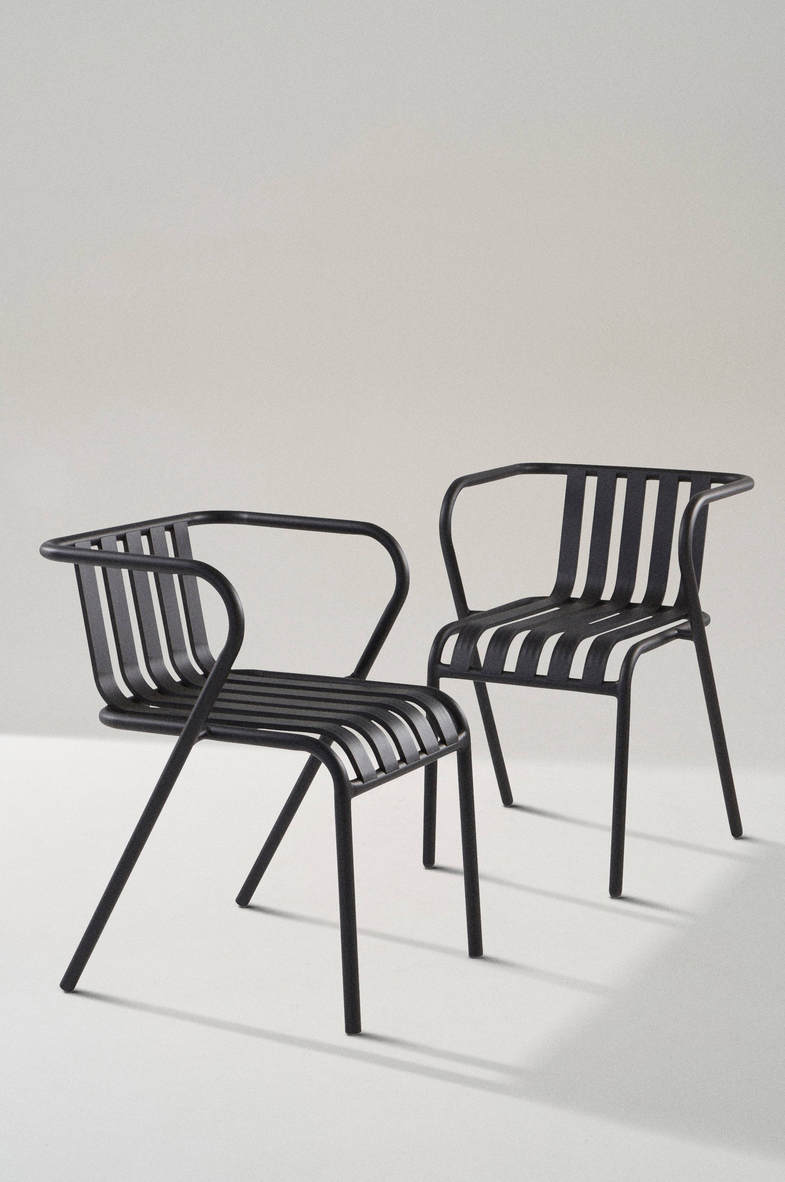 Stole med armlæn i 2-pak af aluminium med mat overflade. Serien NERJA har bløde linjer men er også cool i sit udtryk. Aluminiumsprofilen er lidt kraftigere, men aluminium er et let materiale, så NERJA har en lav vægt. NERJA tåler at stå udendørs, aluminium ruster ikke og er nemt at tørre af. Stolene er stabelbare.