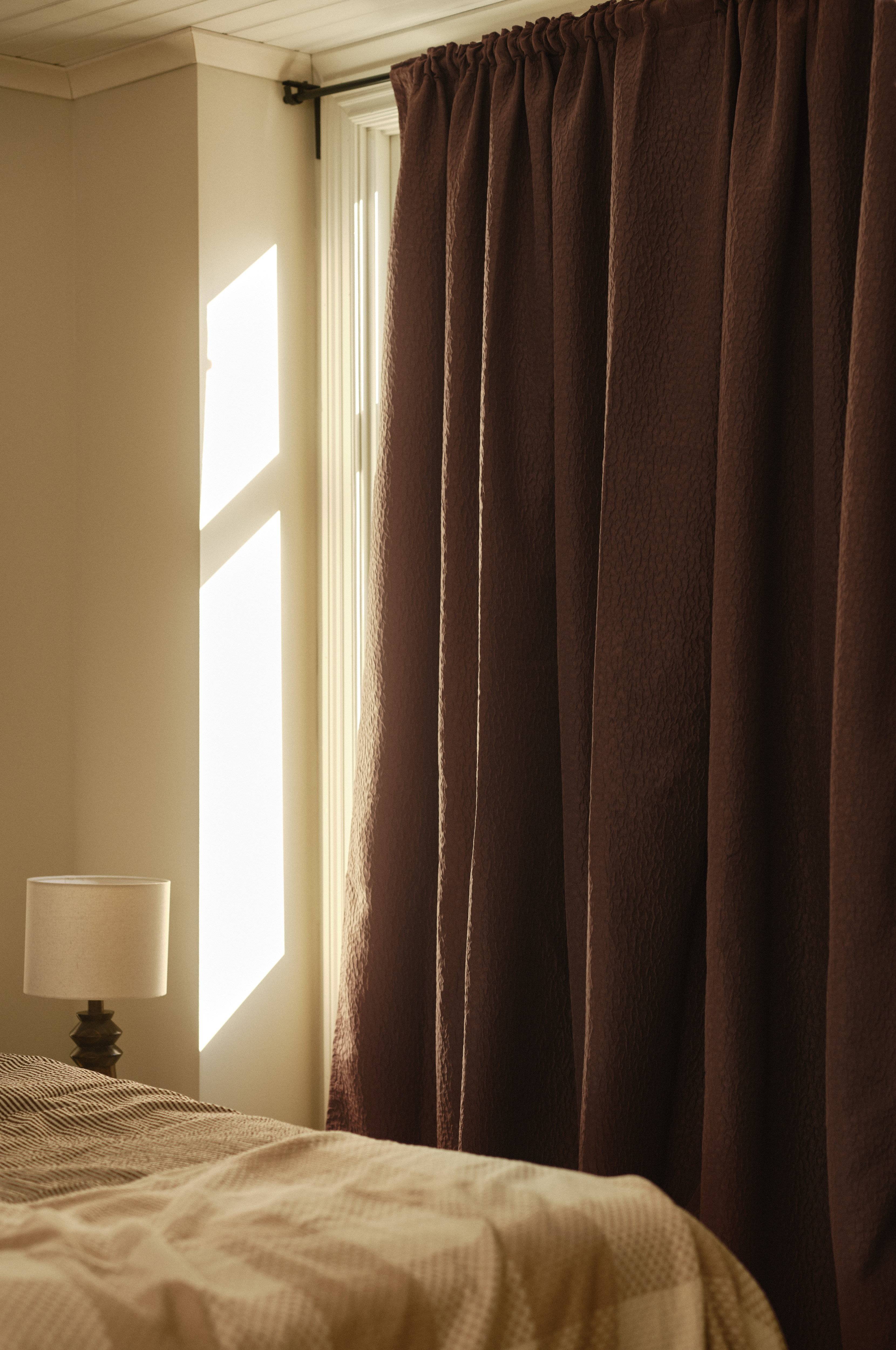 Det ekstra brede og fuldstændigt uigennemsigtige tunge stof skaber en hotelagtig stemning i rummet. Smuk mønstring på overfladen, giver også en holdbar satinfinish på bagsiden.