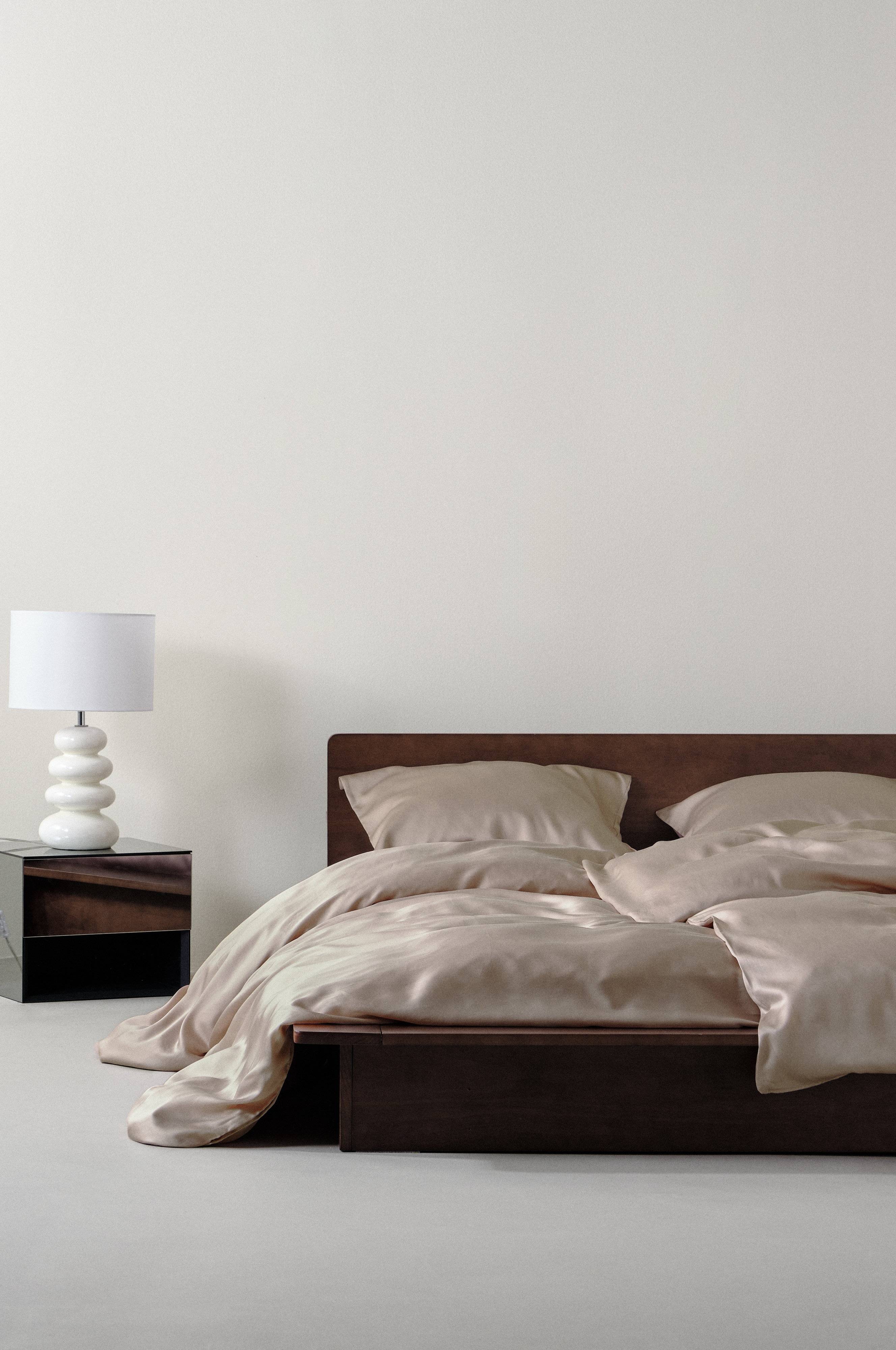 Sengesæt i to dele, et dynebetræk og et pudebetræk, i luksuriøs, satinvævet lyocell. Lyocell er et blødt, behageligt materiale og når det er satinvævet bliver det silkeglat og får en smuk glans som reflekterer lyset. NOELA er ensfarvet i mørke nuancer. Dynebetrækket lukkes med skjulte trykknapper i matchende farve. Åbning i de øverste hjørner på dynebetrækket, så det er nemt at trække dynebetrækket over dynen. Stoffets gramvægt er 118 g/m². Trådtæthed på 300 tc. (Trådtætheden angiver antal tråde, Thread Count, pr. kvadrattomme i et stof. Jo højere trådtæthed desto højere kvalitet.)