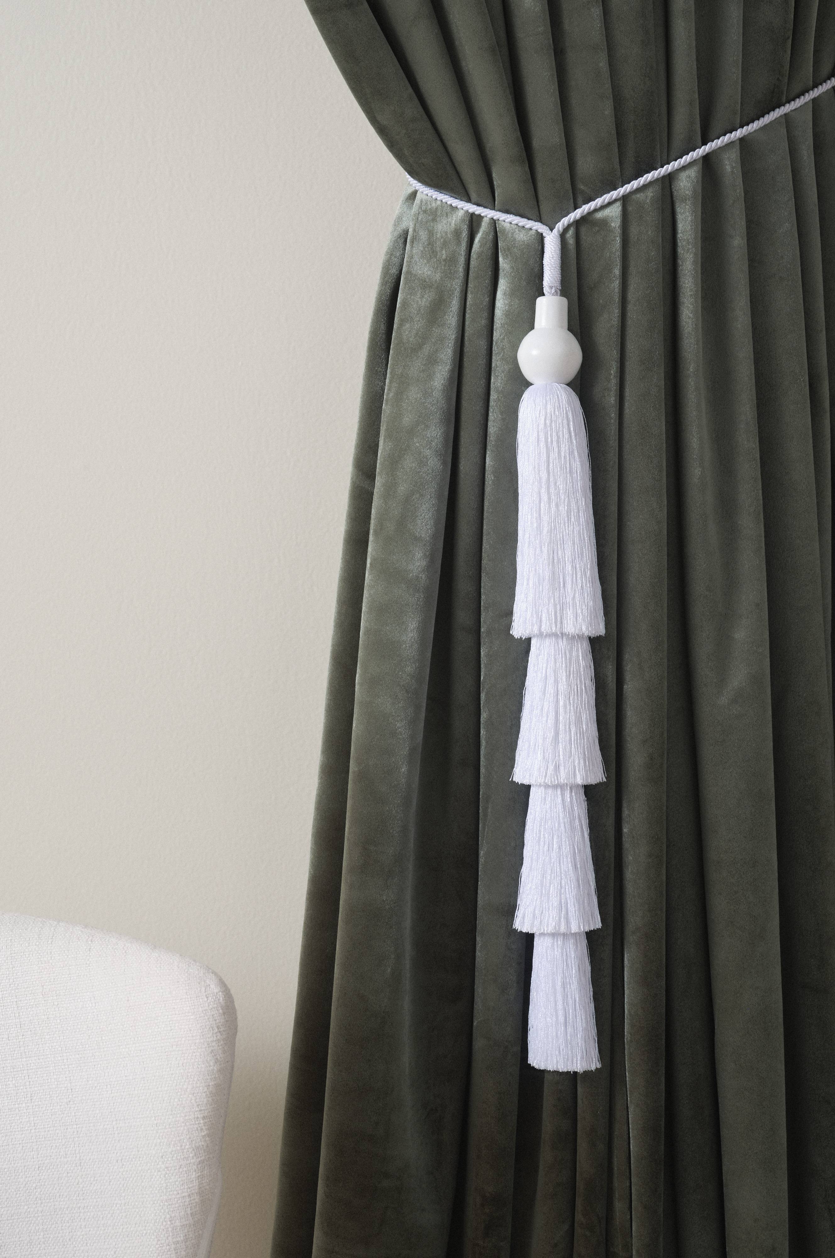 1-pak sidebånd med kvast af polyester iblandet bomuld. NURU er et lækkert, ensfarvet sidebånd med kvast i fire etager med matchende jernkant øverst på kvasten. Sidebåndet med kvaste hjælper dig med at få en fin gardinophængning.