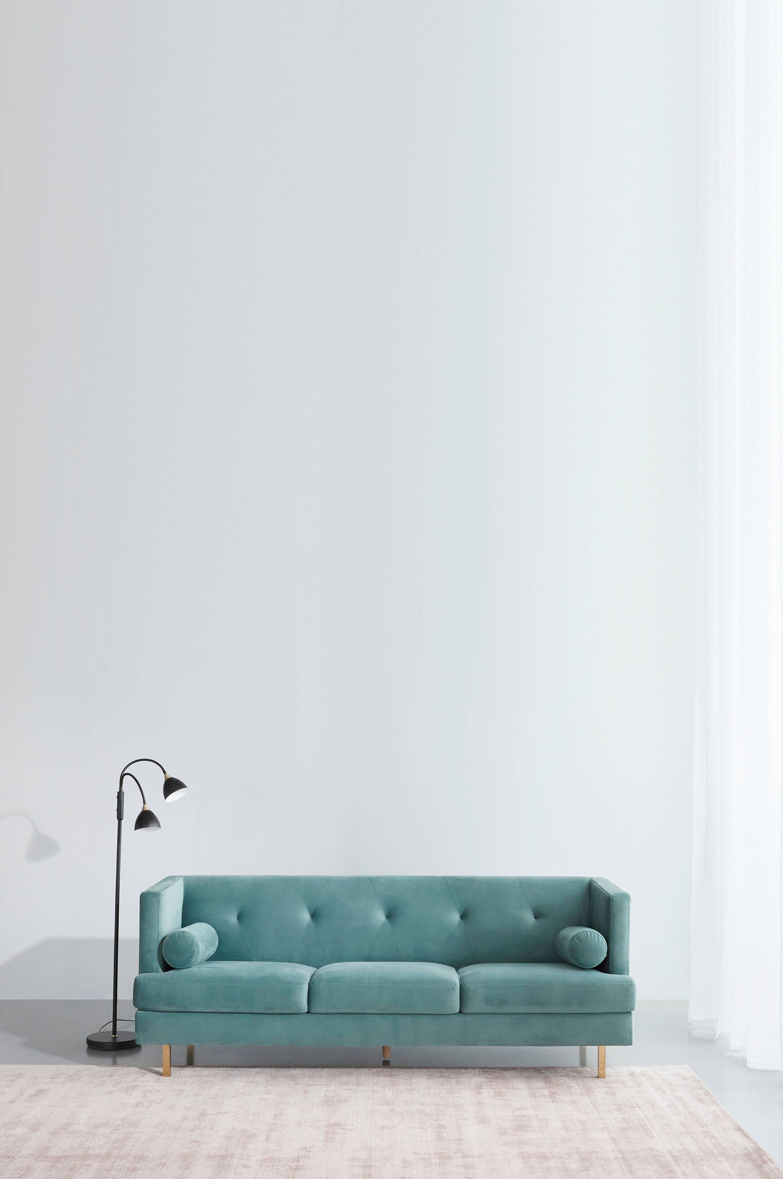 En dejlig 50'er-inspireret fløjlssofa med guldfarvede messingben, som med sin glatte polstring, cylindriske puder og detaljer giver en luksuriøs følelse, hvor end den står. Fløjlsstoffet er meget slidstærkt med en slidstyrke på 100000 Martindale.