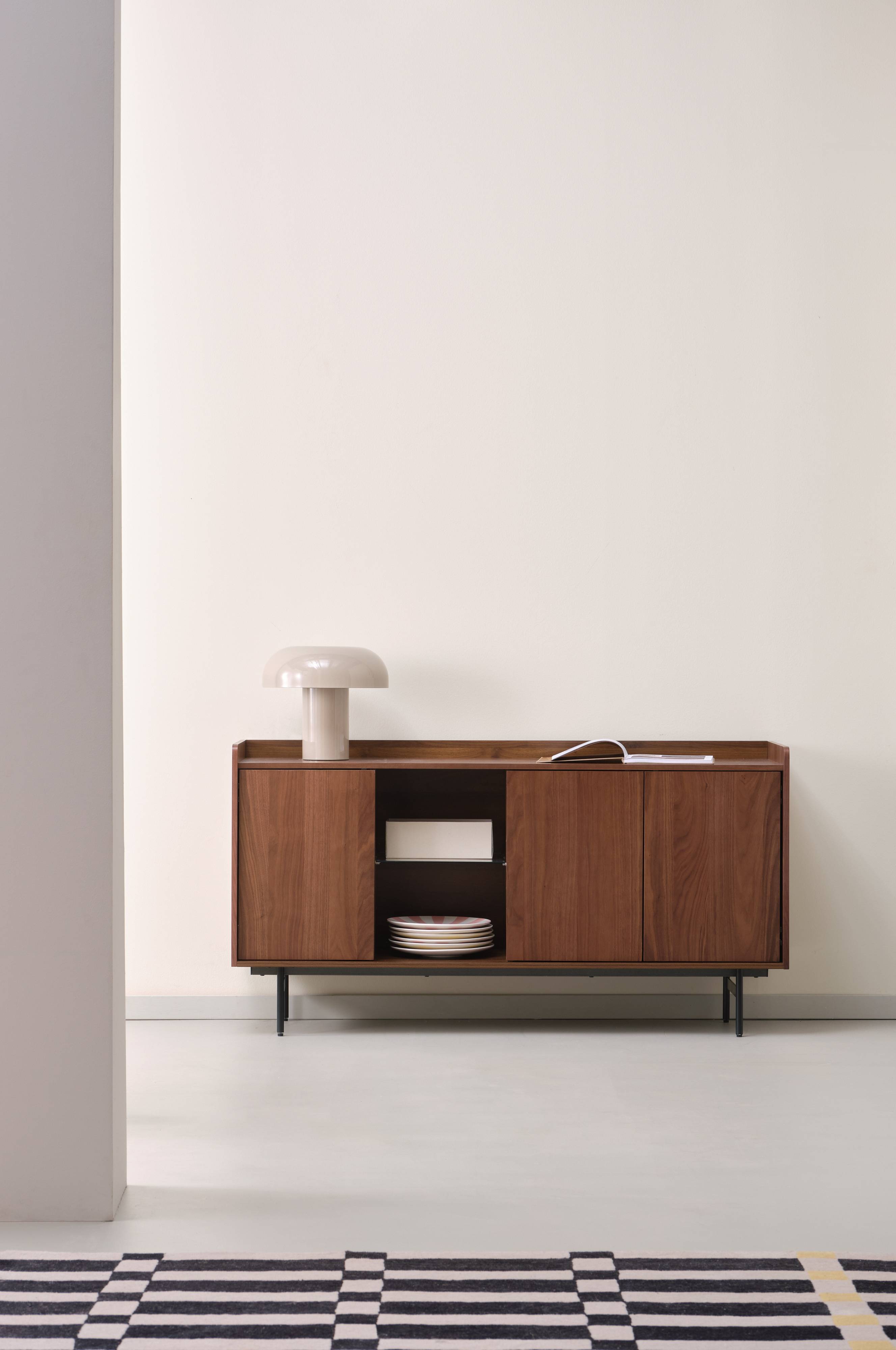 Skænken ÖRGRYTE løfter din stue med sit moderne design. Denne skænk er lavet af fineret MDF med jernben. Fire rum med elegante glashylder og tre forsænkede døre giver god opbevaring og et elegant look. Perfekt til at organisere elektronik eller udstille dekorationer. Dette møbel er alsidigt og passer også godt i dit soveværelse eller på kontoret. Du åbner og lukker dørene med en trykfunktion.