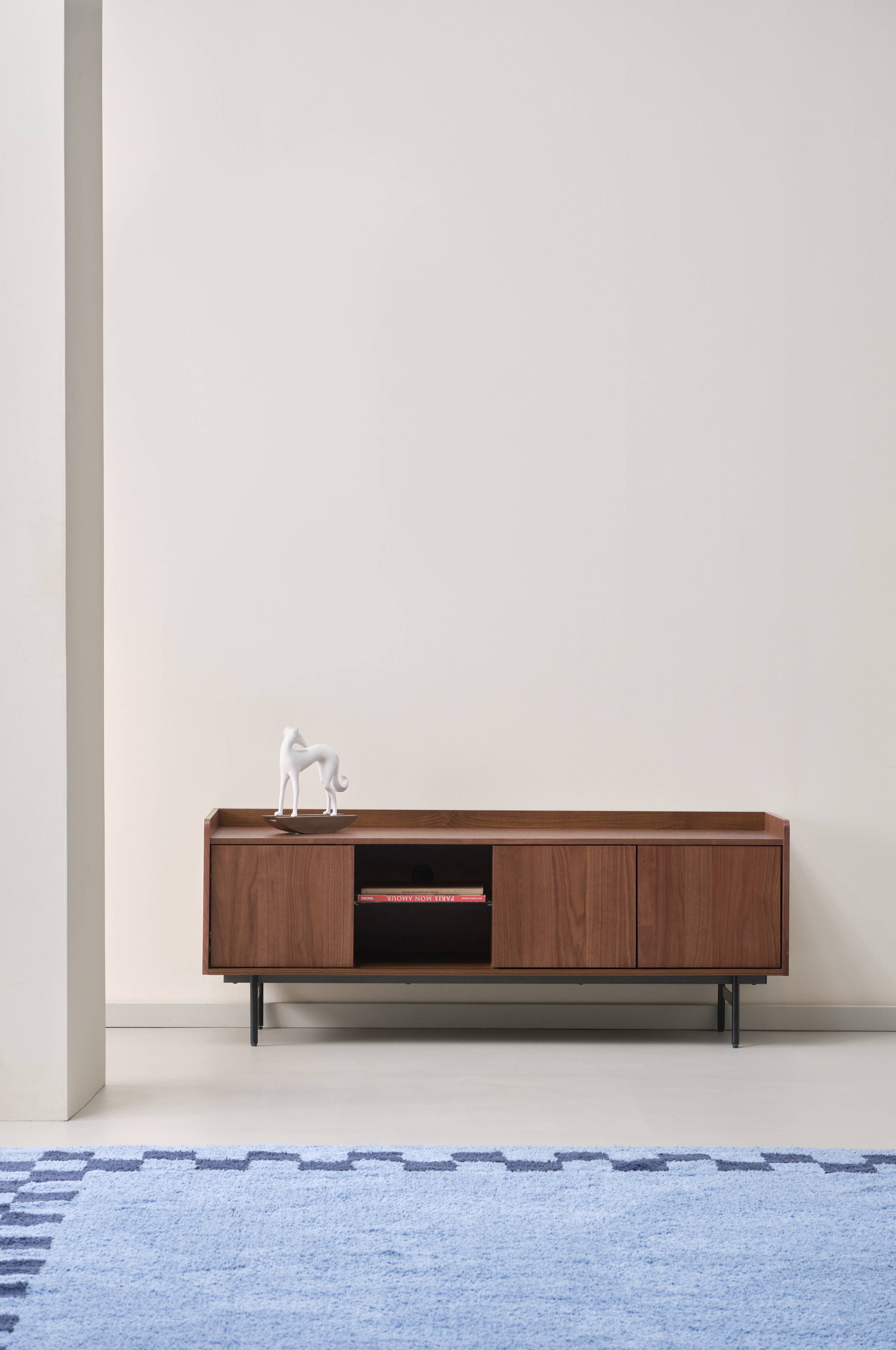 TV-bænken ÖRGRYTE løfter din stue med sit moderne design. Fremstillet af fineret MDF med jernben. Fire rum med elegante glashylder og tre forsænkede døre giver god opbevaring og et elegant look. Perfekt til at organisere elektronik eller udstille dekorationer. Dette møbel er alsidigt og passer også godt ind i soveværelset. Du åbner og lukker dørene med en trykfunktion.