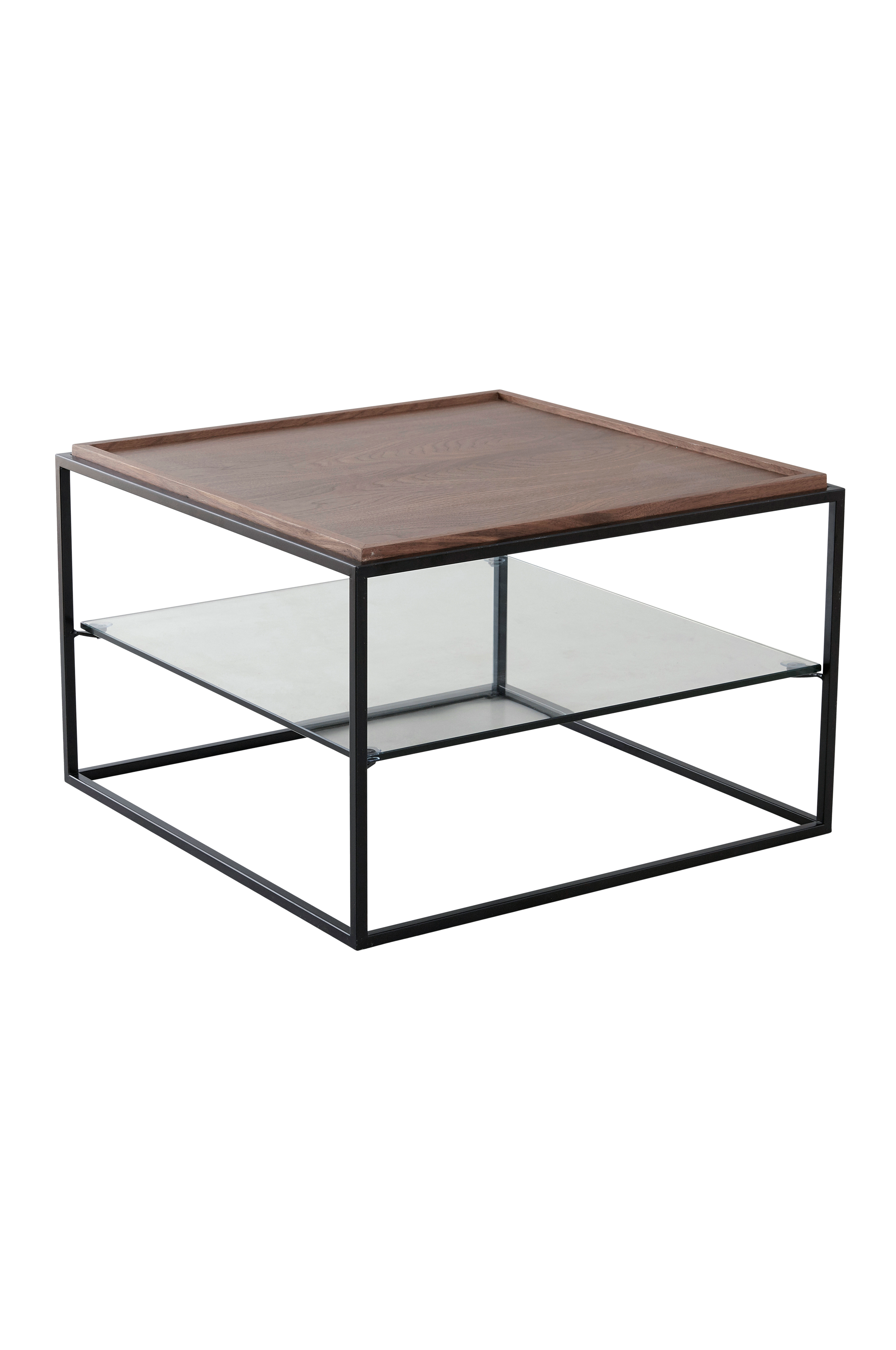 Beskrivelse: Firkantet sofabord med fineret mdf-plade og hylde af klart glas.