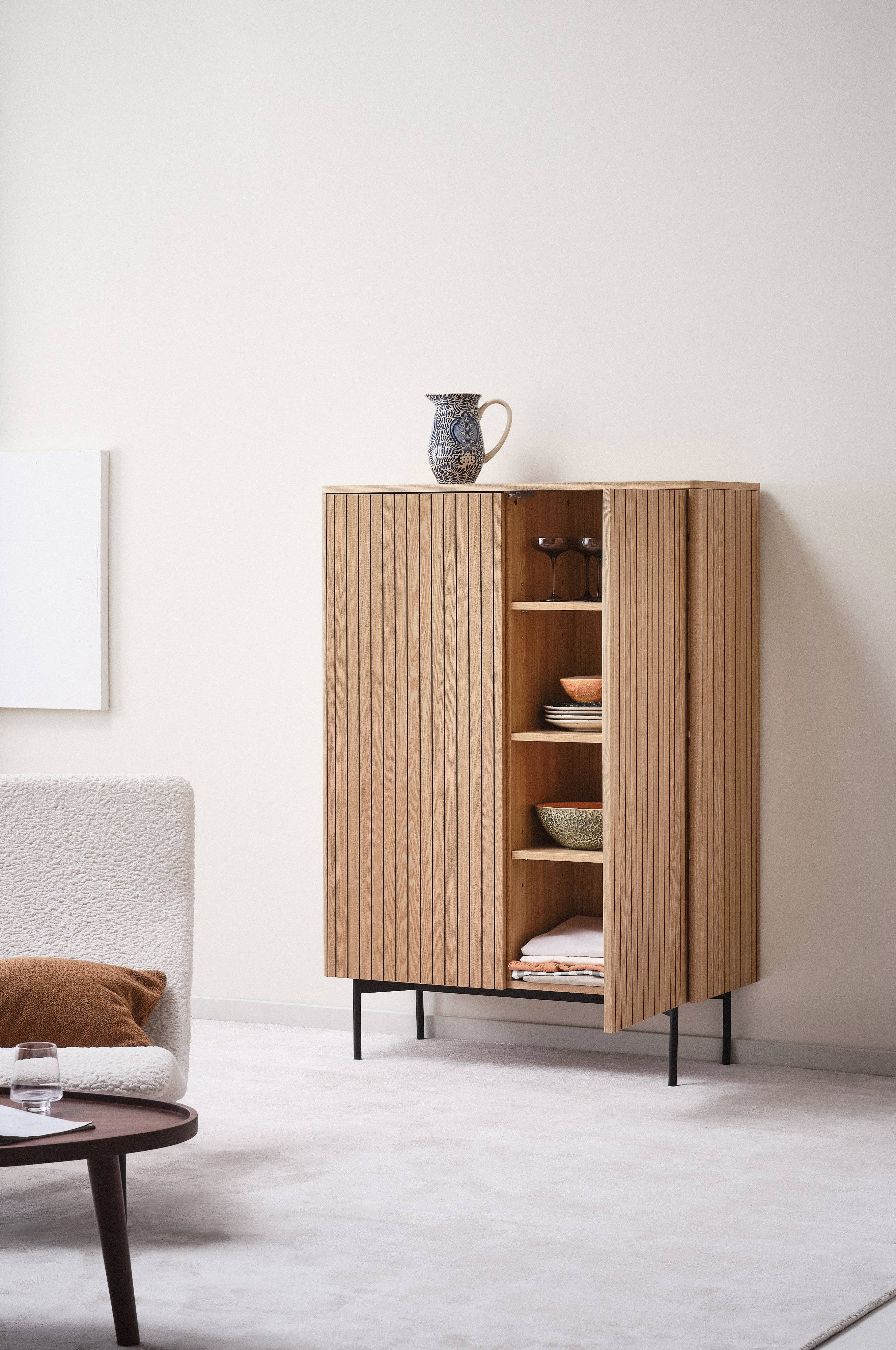 Skab i MDF med askefinér. Skabet har fræsede lodrette striber, der giver en klassisk fornemmelse med et retro-touch. Skabet er stilfuldt med blødt afrundede hjørner, og dørene åbnes med en push-funktion, hvilket betyder, at du skubber døren forsigtigt indad for at åbne og lukke. Skabet har tre faste hylder. De lige stålben er pulverlakerede. PALANZO er et stilfuldt skab, som vil give dit rum attitude, samtidig med at det giver praktisk opbevaring skjult bag lågerne. Vægbeslag medfølger. Skruer medfølger. Lidt montering kræves. Samlevejledning medfølger. PALANZO er en møbelserie med flere flotte møbler, der passer sammen.
