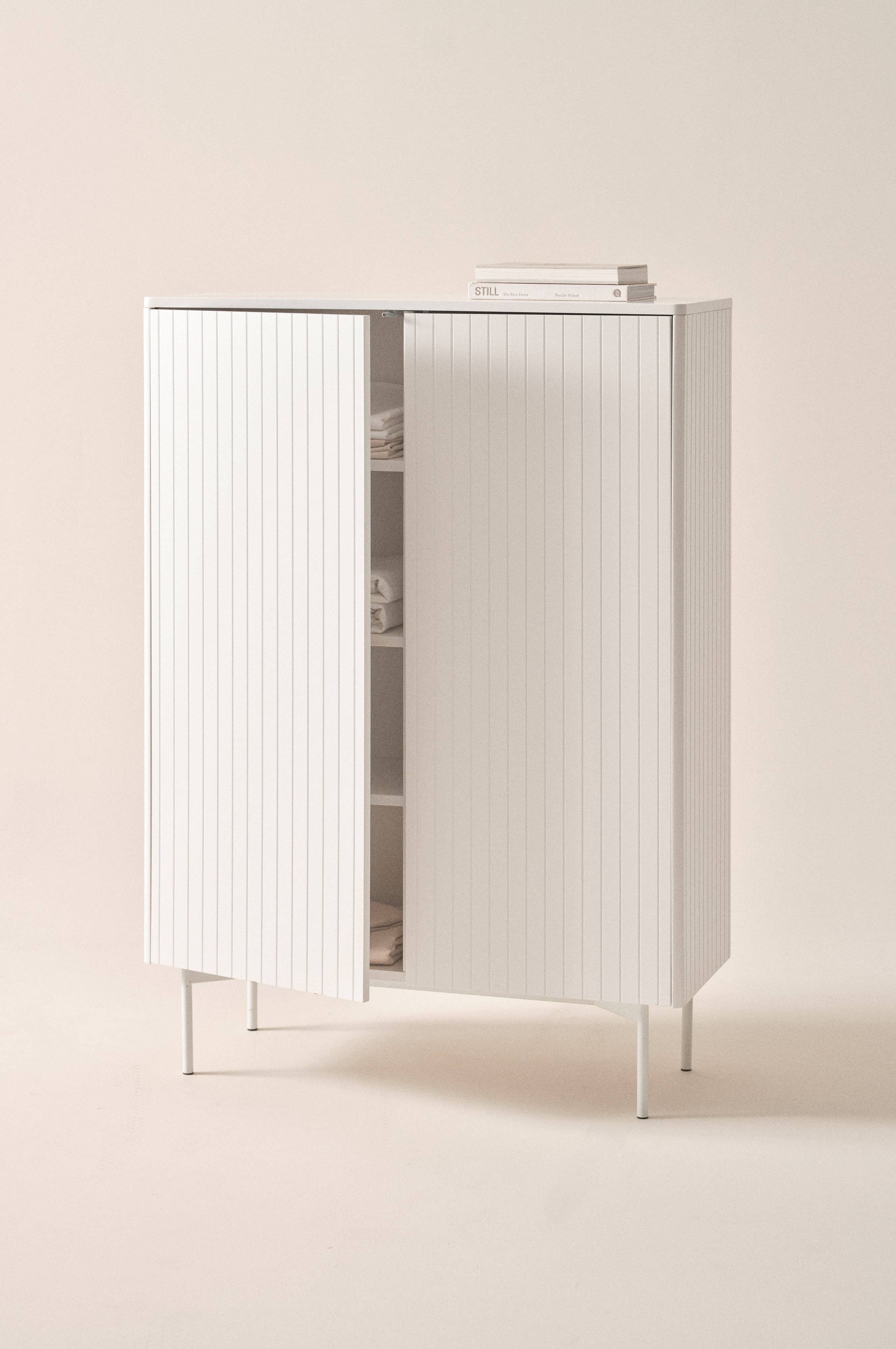 Skab i MDF med askefinér. Skabet har fræsede lodrette striber, der giver en klassisk fornemmelse med et retro-touch. Skabet er stilfuldt med blødt afrundede hjørner, og dørene åbnes med en push-funktion, hvilket betyder, at du skubber døren forsigtigt indad for at åbne og lukke. Skabet har tre faste hylder. De lige stålben er pulverlakerede. PALANZO er et stilfuldt skab, som vil give dit rum attitude, samtidig med at det giver praktisk opbevaring skjult bag lågerne. Vægbeslag medfølger. Skruer medfølger. Lidt montering kræves. Samlevejledning medfølger. PALANZO er en møbelserie med flere flotte møbler, der passer sammen.