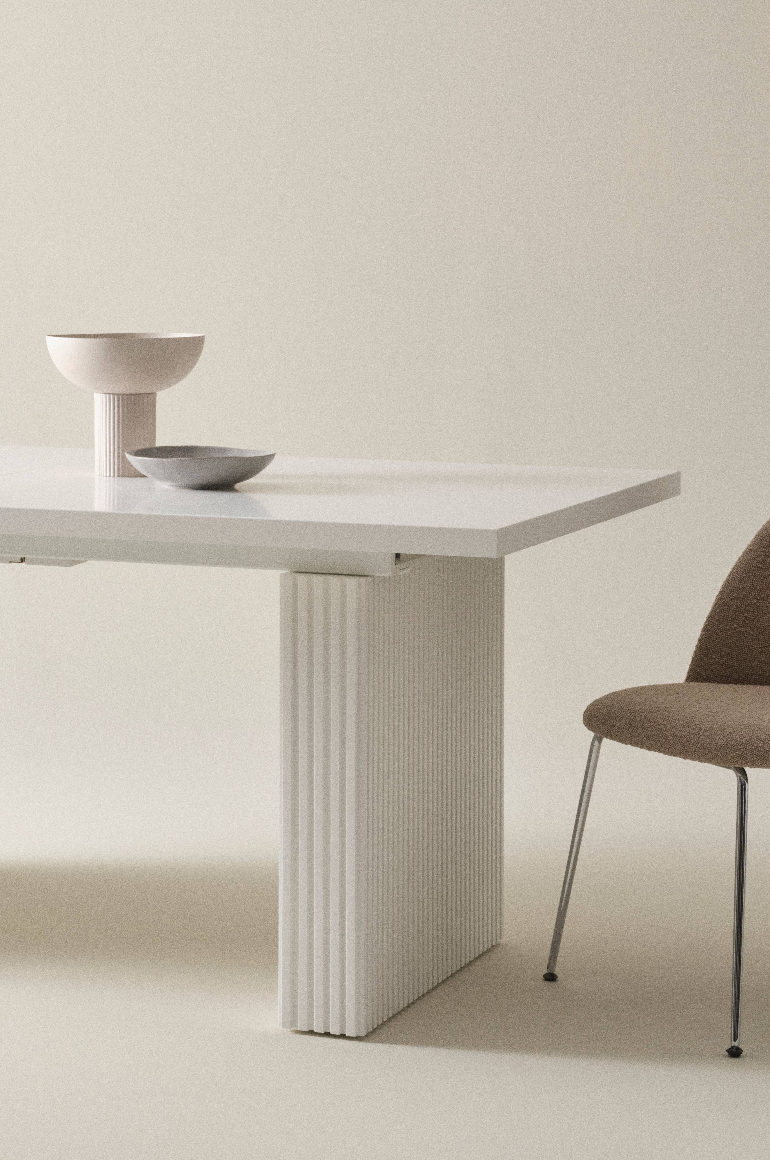 Spisebord i MDF med askefinér. Det solide spisebord har en fleksibel udtræksfunktion med tillægsplade, der giver dig plads til mere, når vennerne kigger forbi. Tillægspladen foldes ned og opbevares i bordet, når den ikke er i brug, praktisk og nemt. De to robuste bordben har udfræsede, lodrette striber, der giver en klassisk følelse med retro-elementer. Bordet er stort og stilrent med kantet bordplade og blødt afrundede hjørner på benene. PALANZO er et fleksibelt og elegant bord som giver dit rum attitude. Skruer medfølger. Lidt montering kræves.